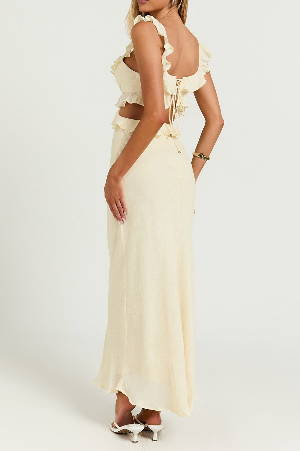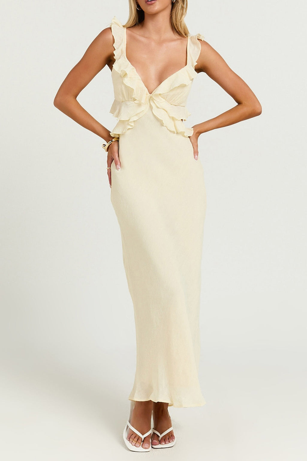 Introducing the Dahlia Midi Dress. The cutest slip dress with ruffle details to front and back, A dress that embodies the essence of summertime. Featuring a V neckline and gorgeous tie back.