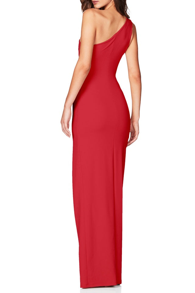 This is a stunning one shoulder gown. It features thick one shoulder strap, thigh high split in a stretch scuba fabric. Fully lined. A favourite hire.