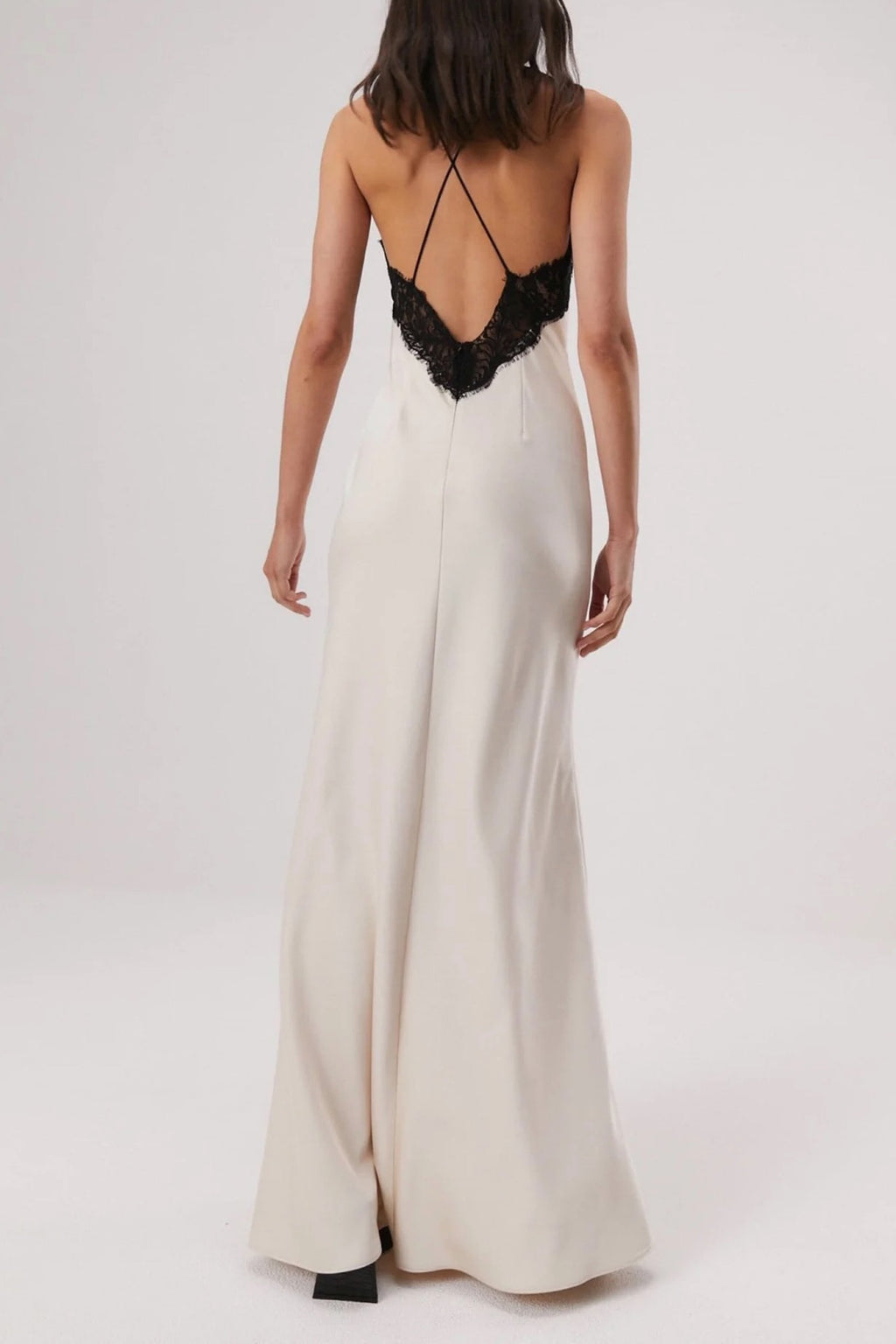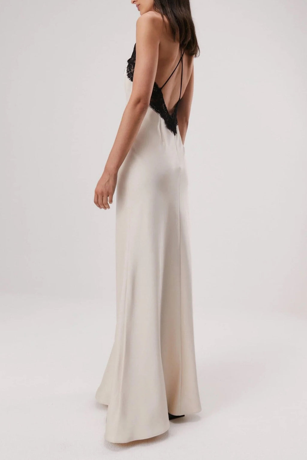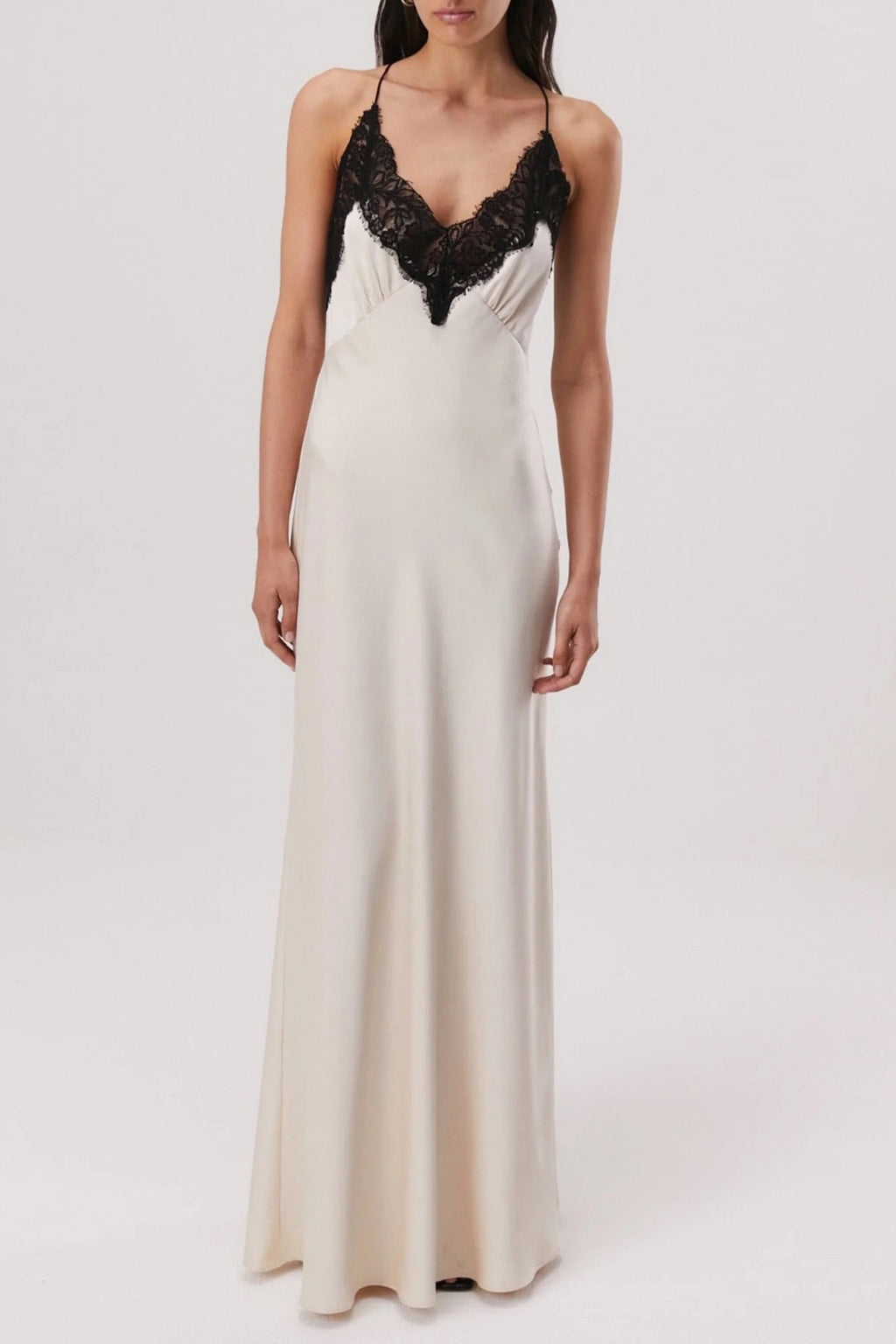 The Eanna by Misha is a stunning lace/satin maxi. It features delicate black lace detailing along the neck & back, flattering bias cut, thin straps, gathered bust detailing & cross over back in a stunning champagne satin.