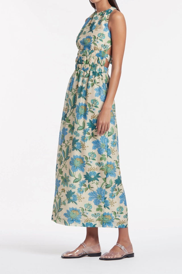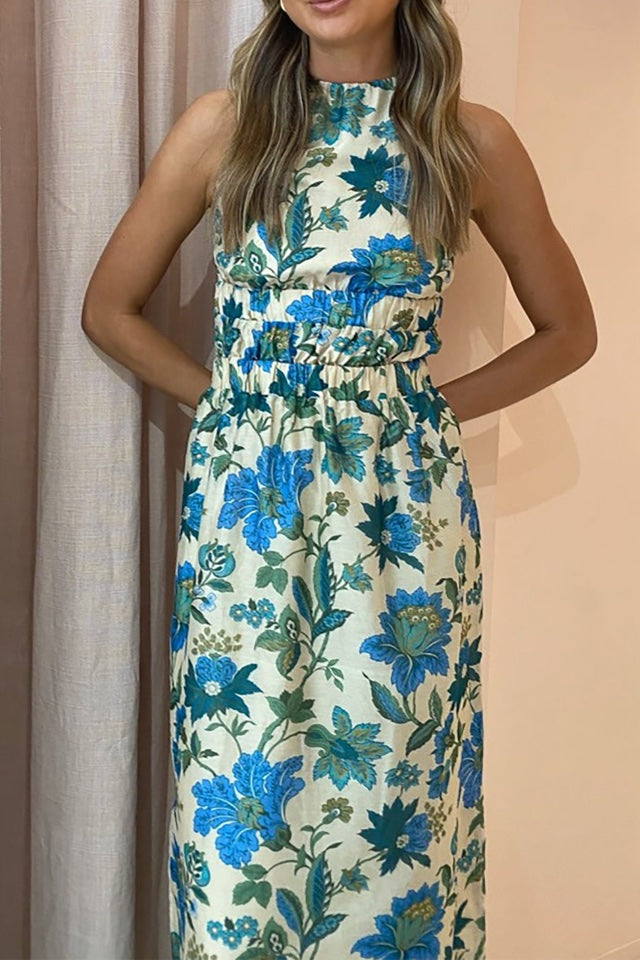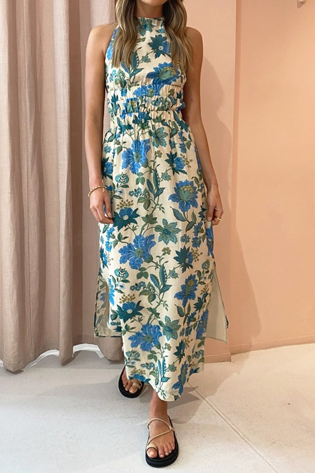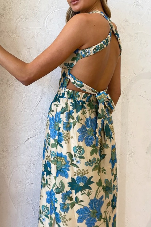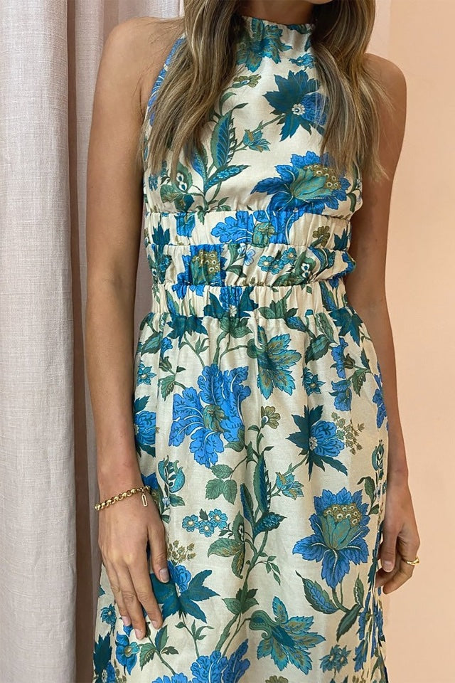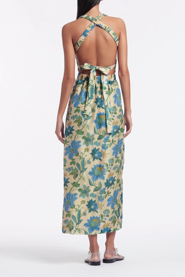 Introducing the Celia Gown in the stunning Marguerite print by Sir the Label. Cut with a high neckline and sleeveless silhouette, the Celia Cross Back Gown is crafted from a signature cotton silk blend with a rayon lining. It is fitted through the bust and waist & features an elasticated under-bust and waist channels, elasticated cross back straps, self-tie bow across the exposed lower back & straight midi skirt.