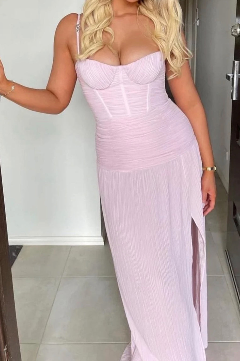 A gorgeous light pink colour way of the Double Time Pleat Dress by Manning Cartel. The dress features elegant pleats throughout, boning through the corset top & beautiful maxi skirt with a subtle split.