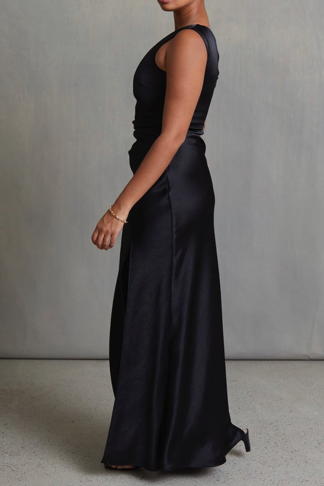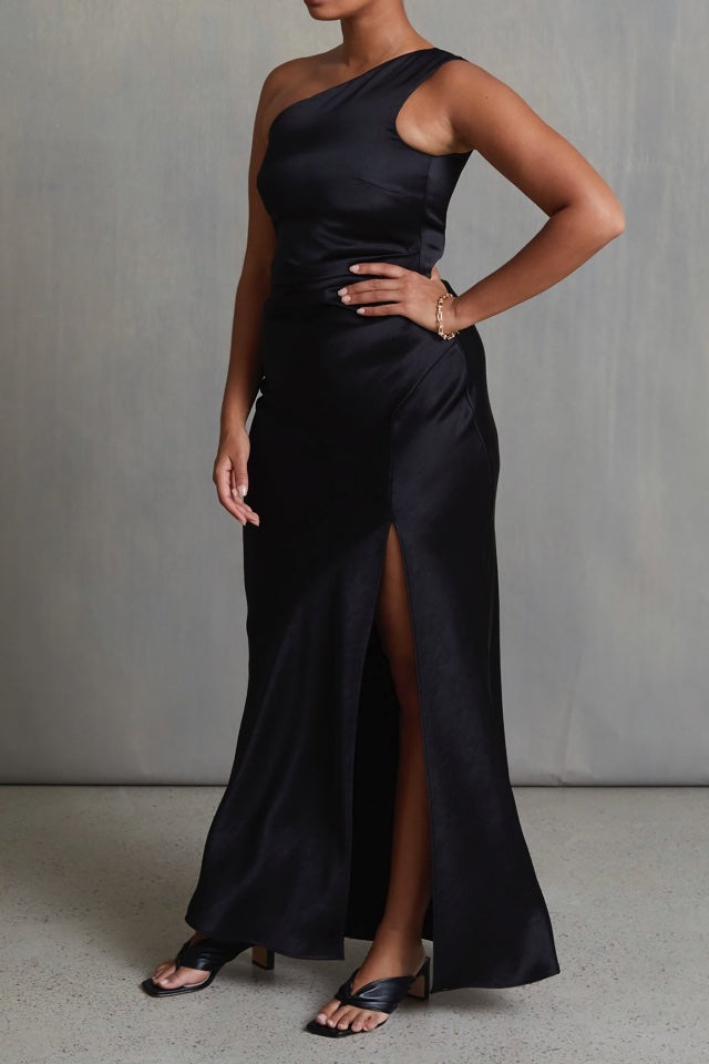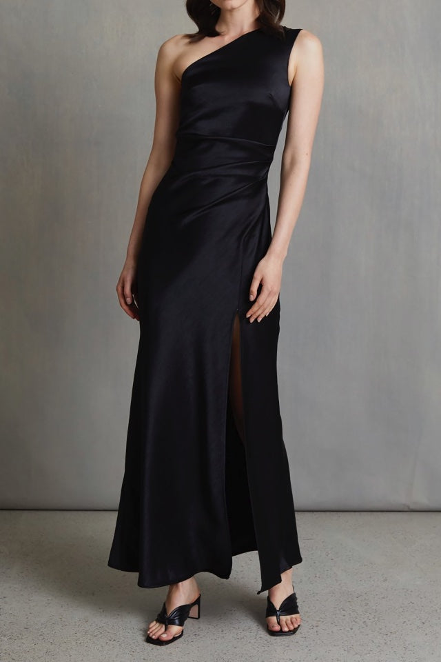 A beautiful floor length dress by Bec & Bridge. It features side tuck details, asymmetrical neckline and gorgeous split to leg.