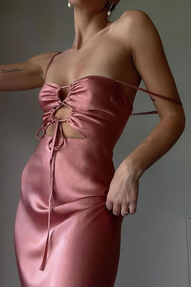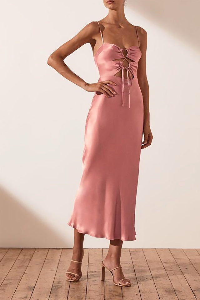 A beautiful midi by Shona Joy in stunning Antique Rose Pink. It features a lace up front, luxurious sheen, adjustable straps & mid length bias cut skirt.