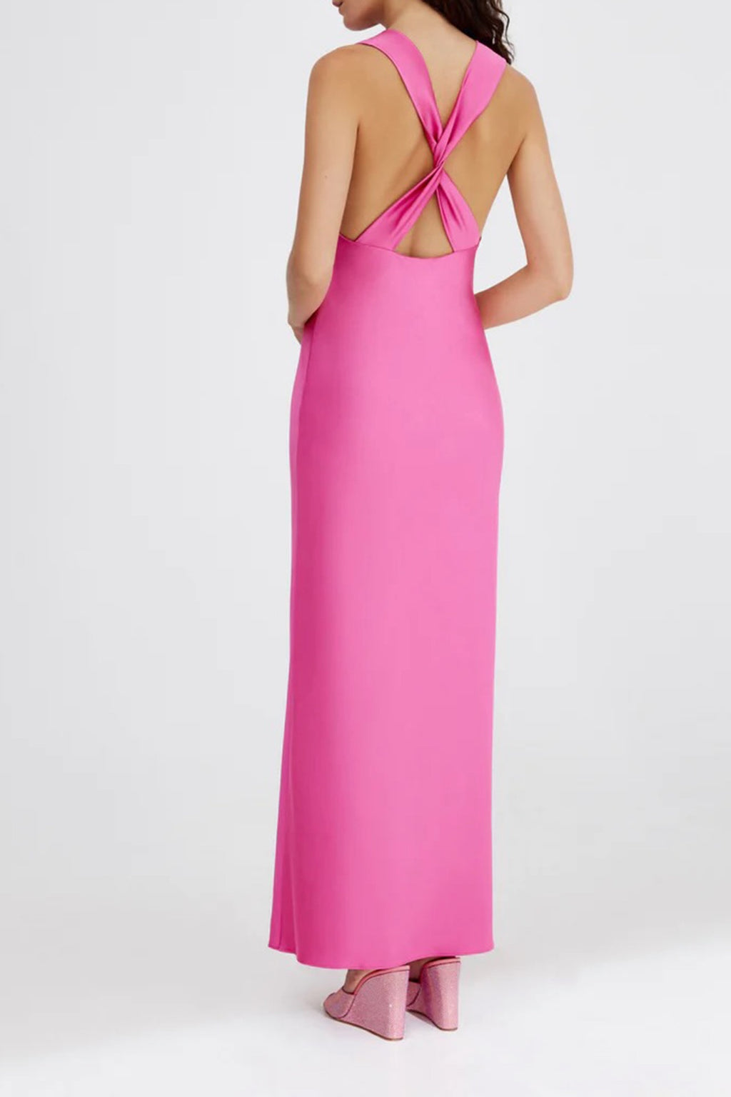 The Lara Backless Dress in Pop Pink by Significant Other is a statement silhouette. In a satin fabric this stunning dress is complimented with a high neckline & cross over back detail.