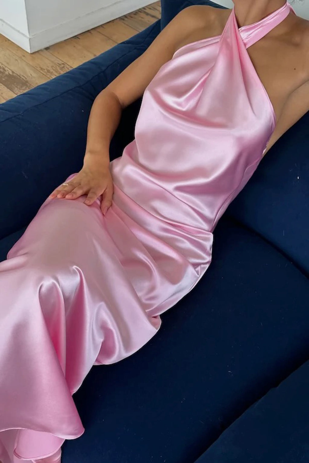 Bias cut maxi dress with crossover neck feature and adjustable behind the neck tie. Deep V finish at back.