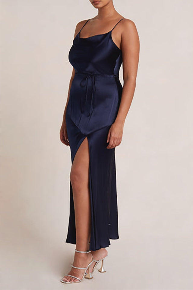 A flattering bias-cut slip dress by Bec & Bridge which features slight cowl neckline, thin rouleau straps and tie waist detail. The Moon Dance Midi has a statement front leg split.