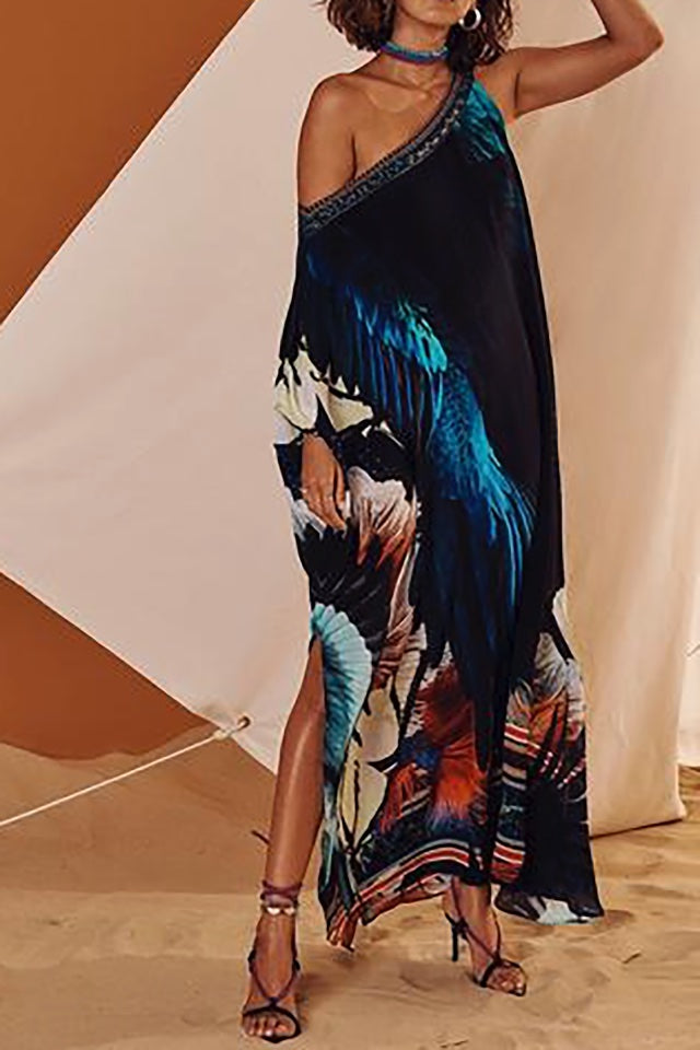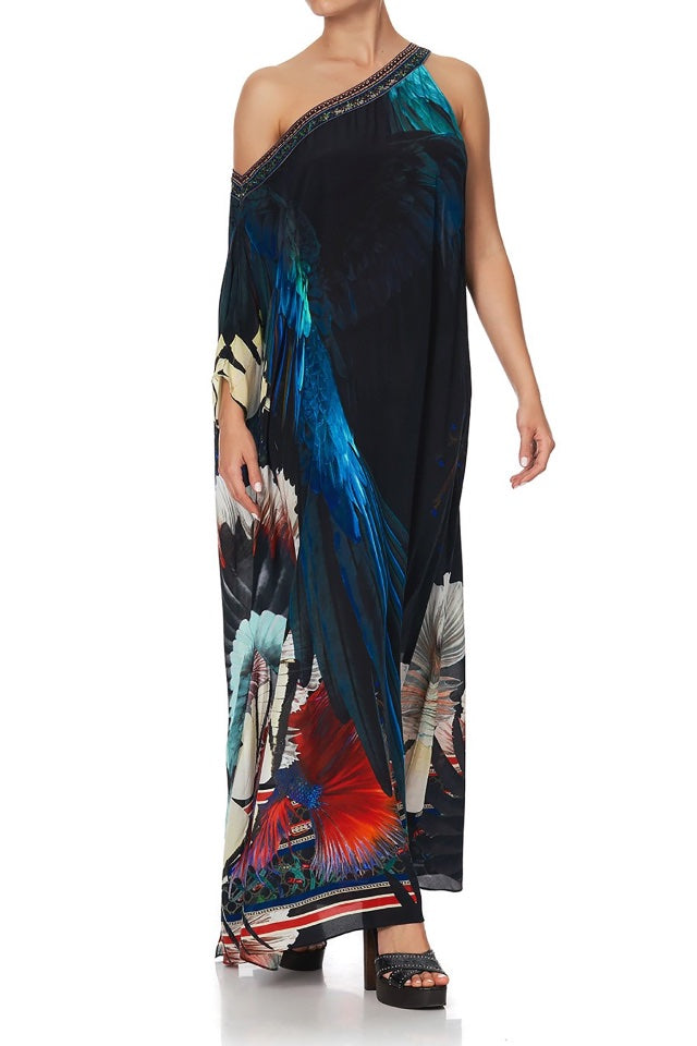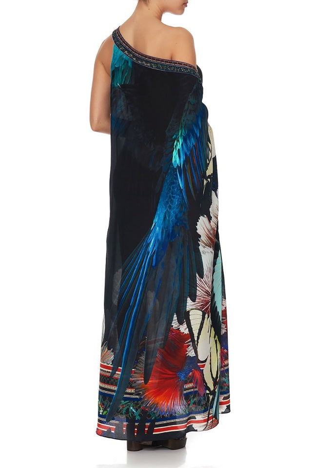 Dress print is inspired by a birds eye view to the magnificently serene rainforest coastline of Queensland. In a heavenly printed silk this elegant asymmetric shouldered design features side splits and hand-applied crystals. Incredible dress.
