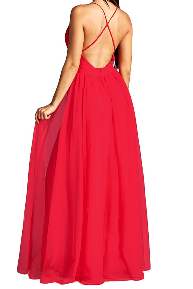 Stunning gown by Glamour Boutique.  The Tallulah features a fitted waistband with deep V neckline, open back, thigh high front splits, thin straps, cross over back and flowing tulle skirt.