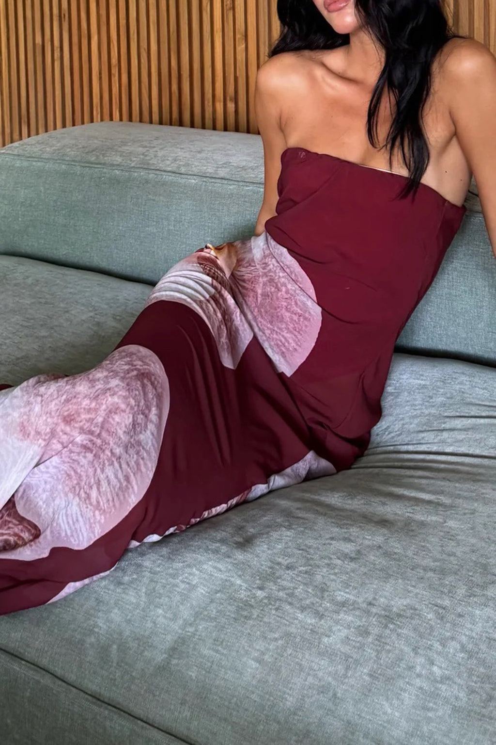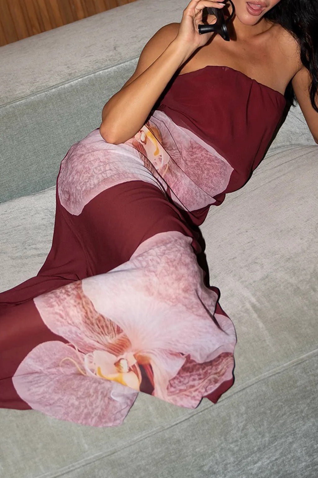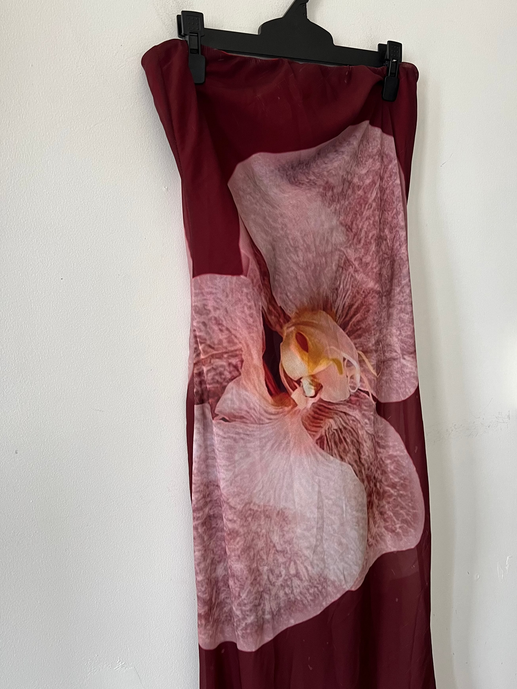 A stunning new arrival from HNTR the Label. The Alessia Maxi has custom printed flowers on a rust red base. The built in body suit gives the perfect shape, support and coverage for under.
