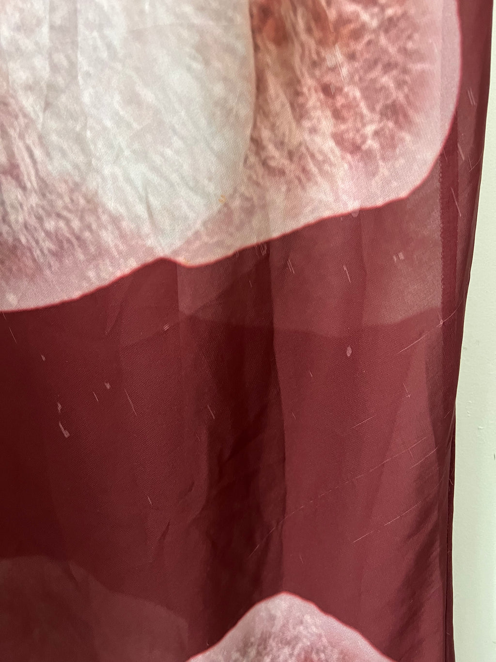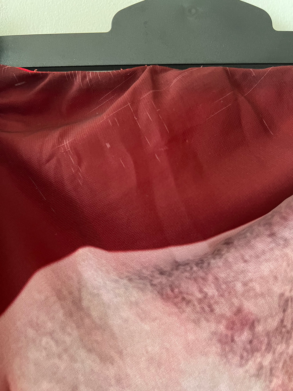 True fitting with some stretch. Semi sheer except for bodysuit area. *Please note this dress is not in perfect condition. Dye in the red part of dress has come out in some places + there is a small hole. Still looks lovely on - Pics below. Price reflects wear. Slightly shorter than pic shows.