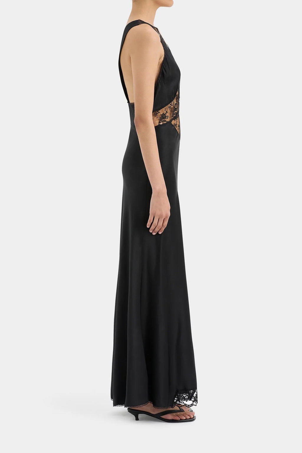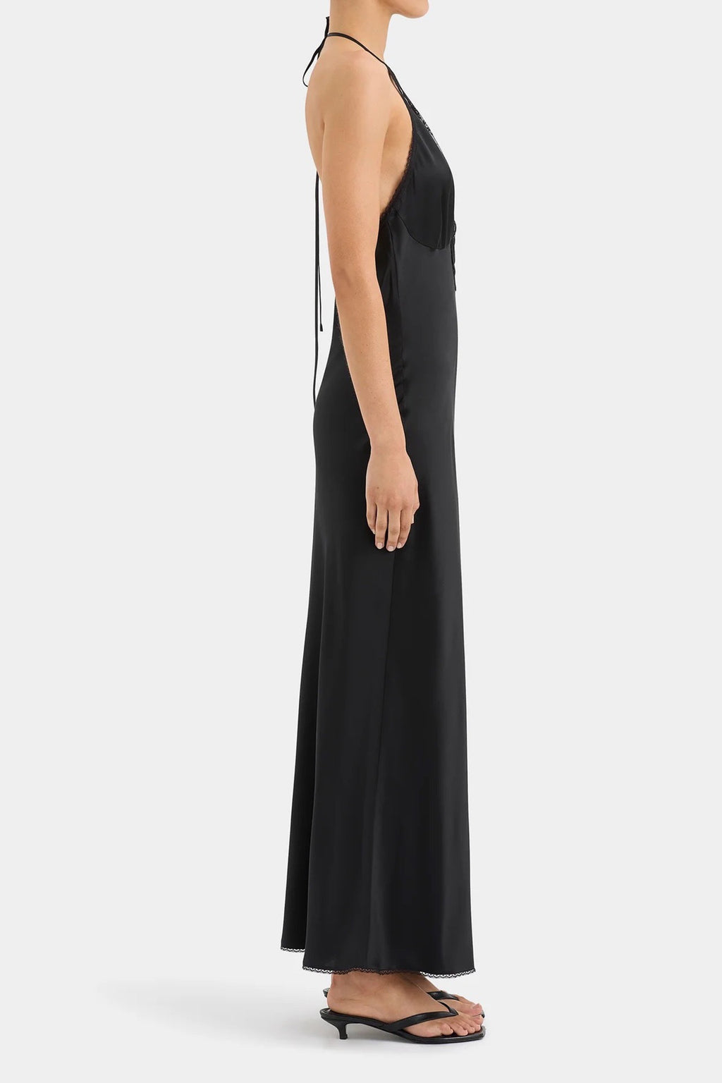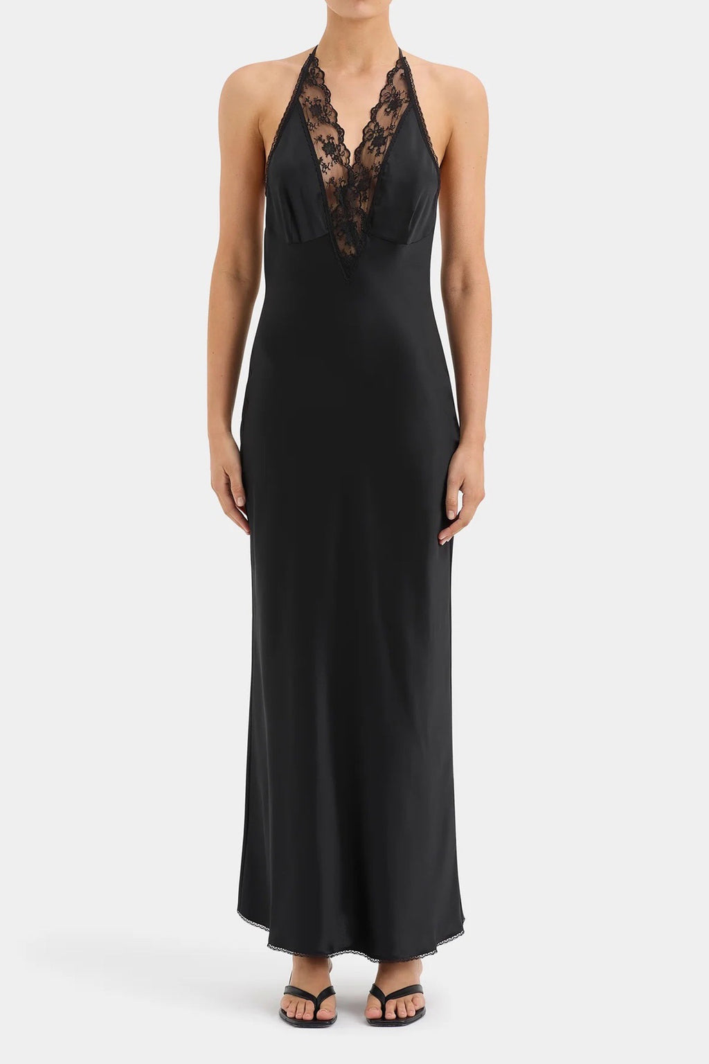 The Aries Halter Gown by Sir the Label is crafted from a silk fabric with delicate floral lace inserts. The flattering bias cut skims the body. It features a halter neck design with an open back.