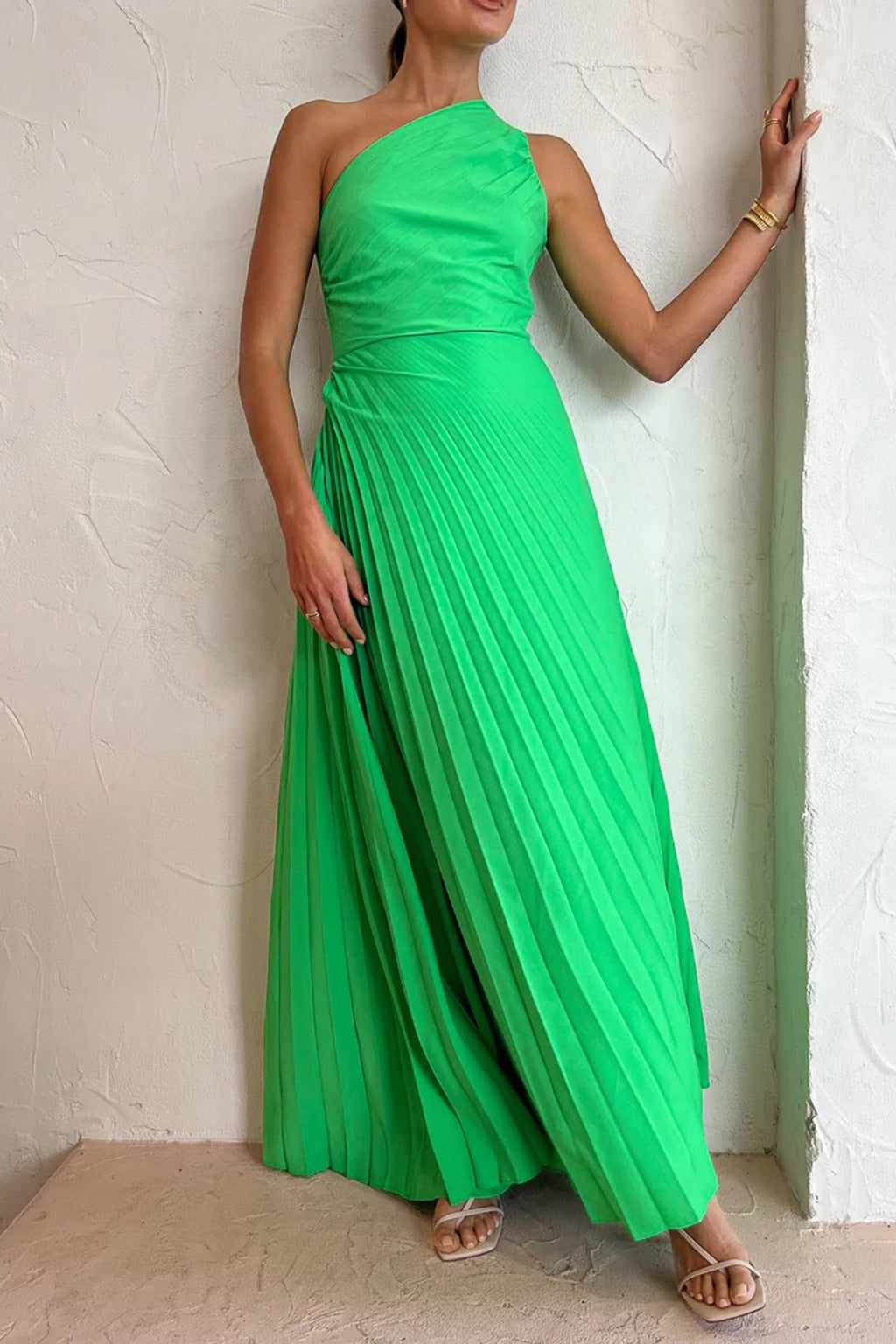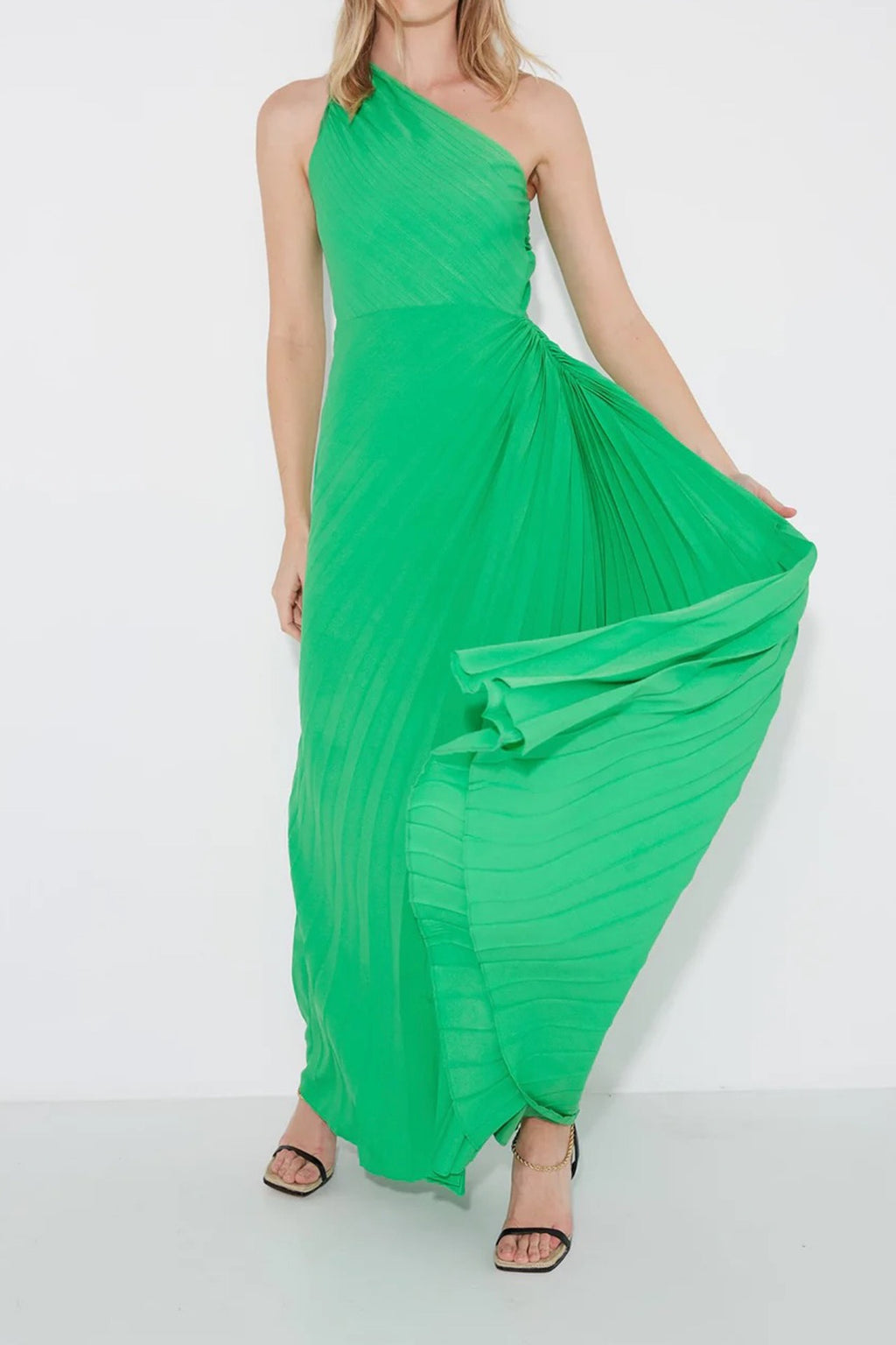The Azalea Gown by Sonya features a one-shoulder silhouette designed with pleats cut on the biased and artfully gathered on the hip. All eyes will be on you in this gorgeous timeless gown.