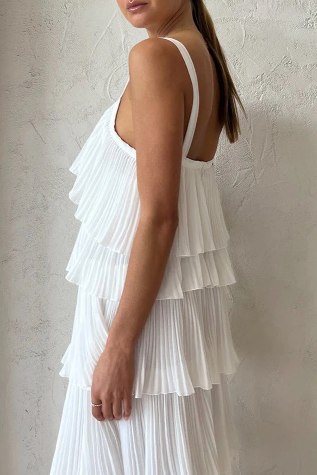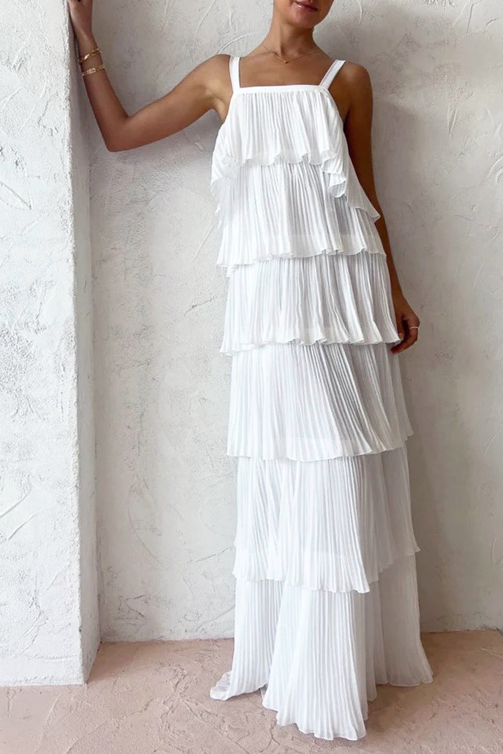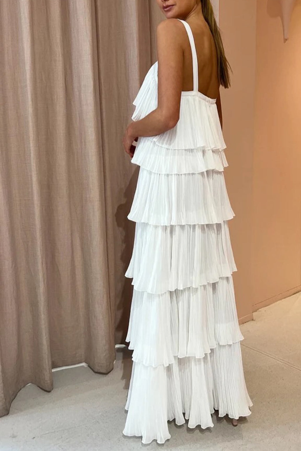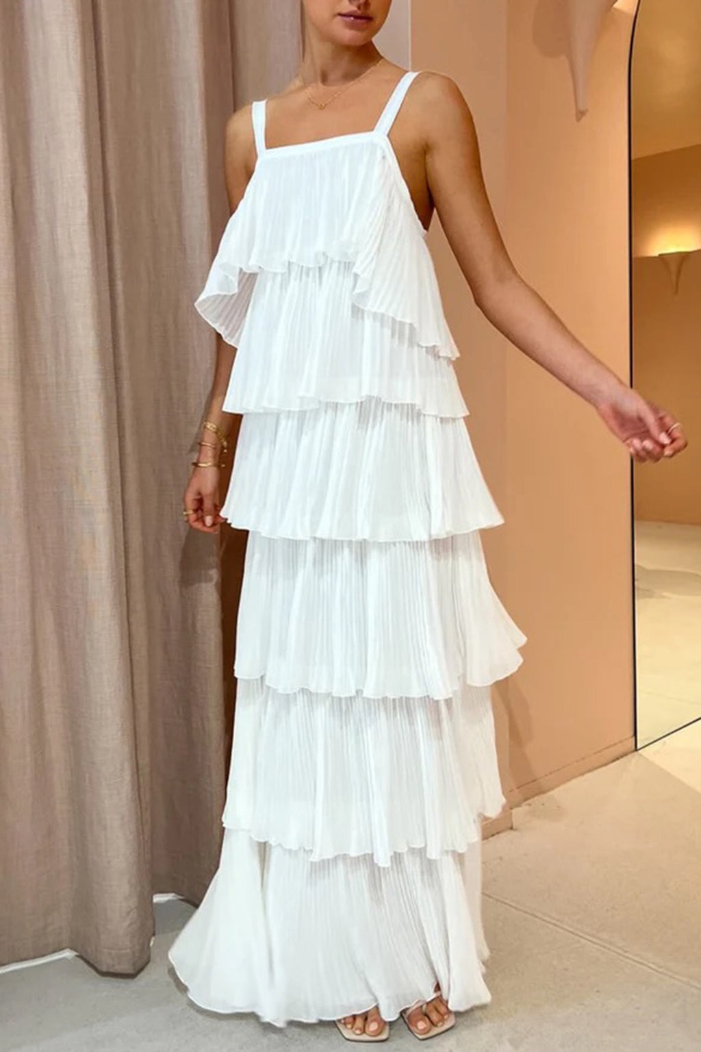 The Classique Gown by Lidee is a stunning dress that features a square neckline before softening into a tiered floor length silhouette. Made from a  delicate crepe fabric.