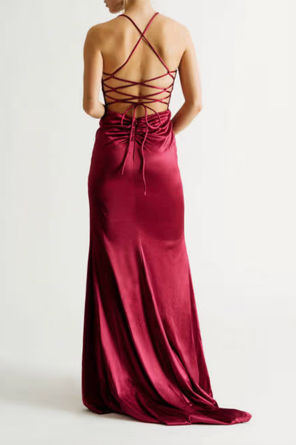 The Peisinoe Maxi Dress is a stunning formal dress in dark red tone. It features a deep V neckline, ruched details, spaghetti straps & lace up back. Designed to show off your curves.