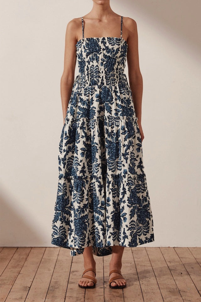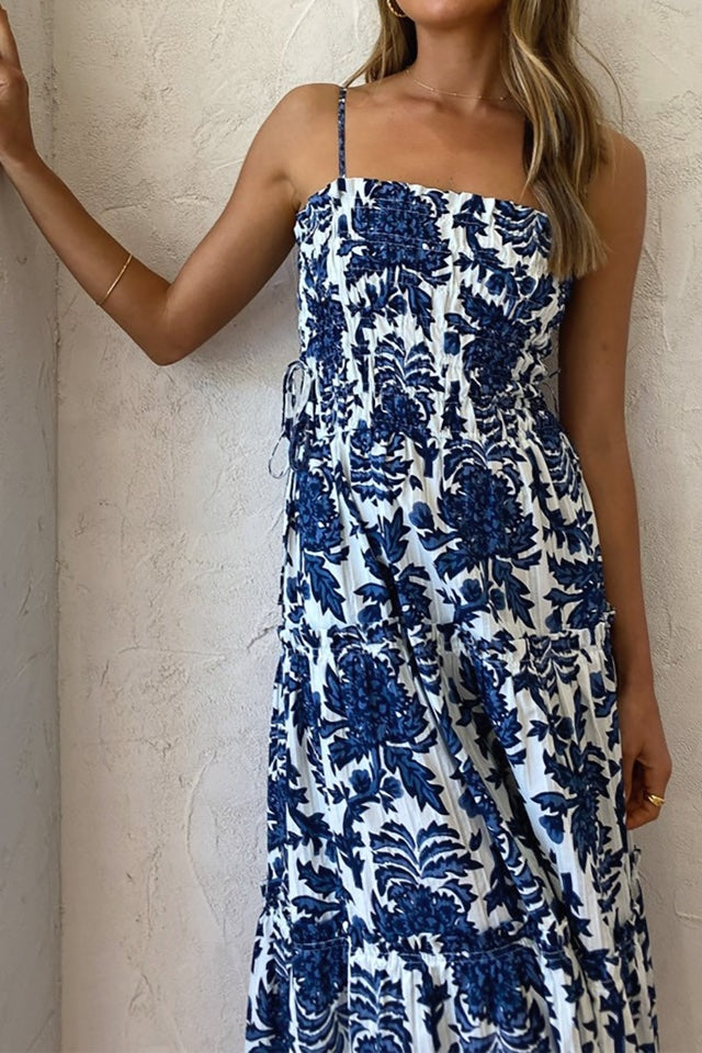 A stunning midi dress from Shona Joy. A fav hire. The Diana design features a beautifully detailed print with shirred elastic top, drawstring ties to the waist, adjustable straps, side pockets and frill details.
