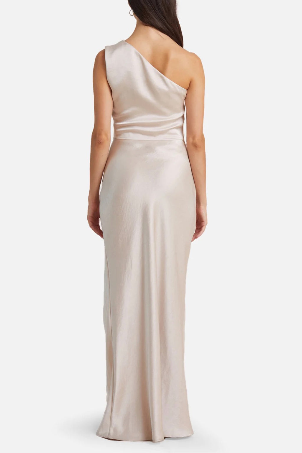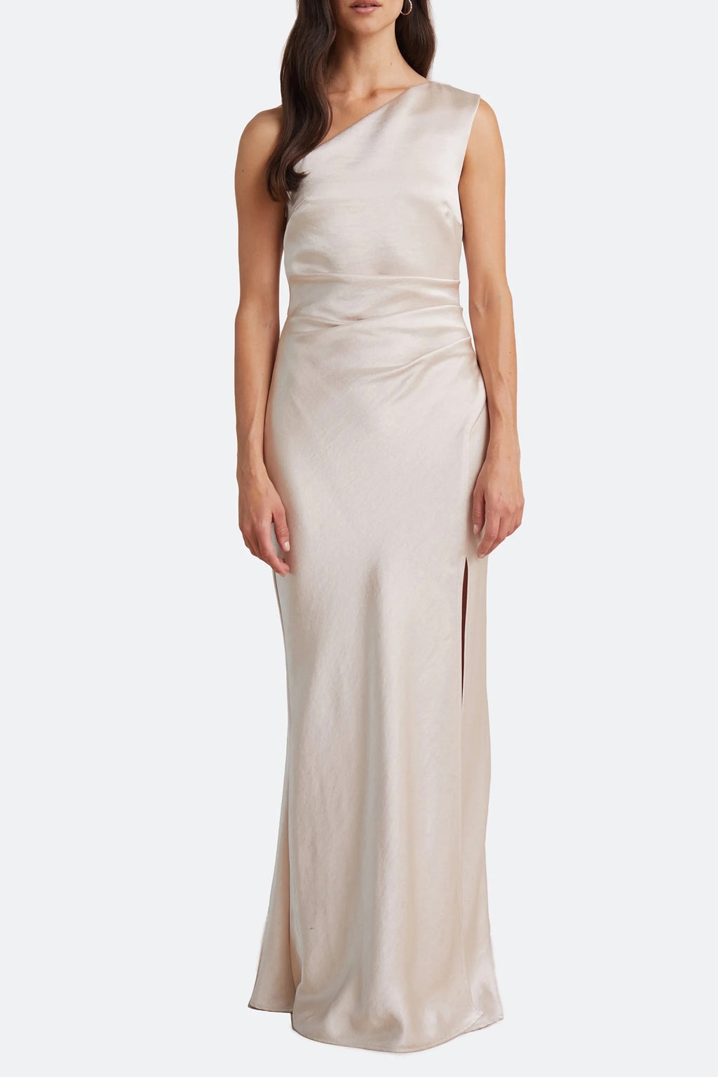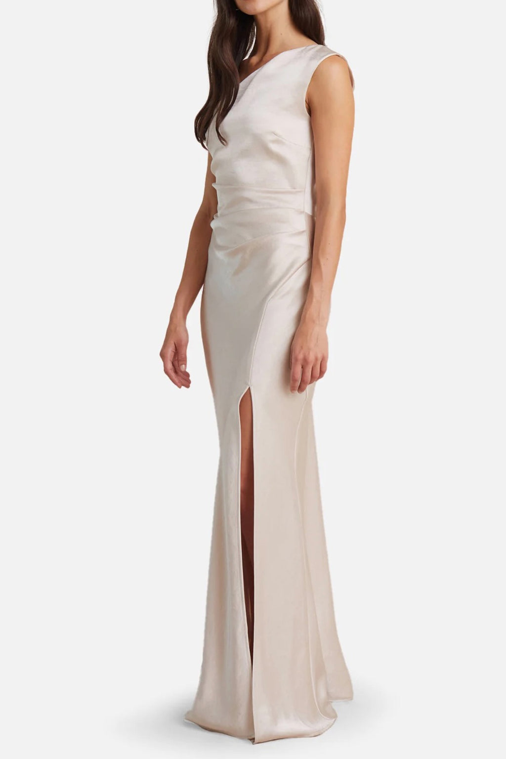 A beautiful floor length dress by Bec & Bridge. It features side tuck details, asymmetrical neckline and gorgeous split to leg. Stunning silvery/champagne tone.