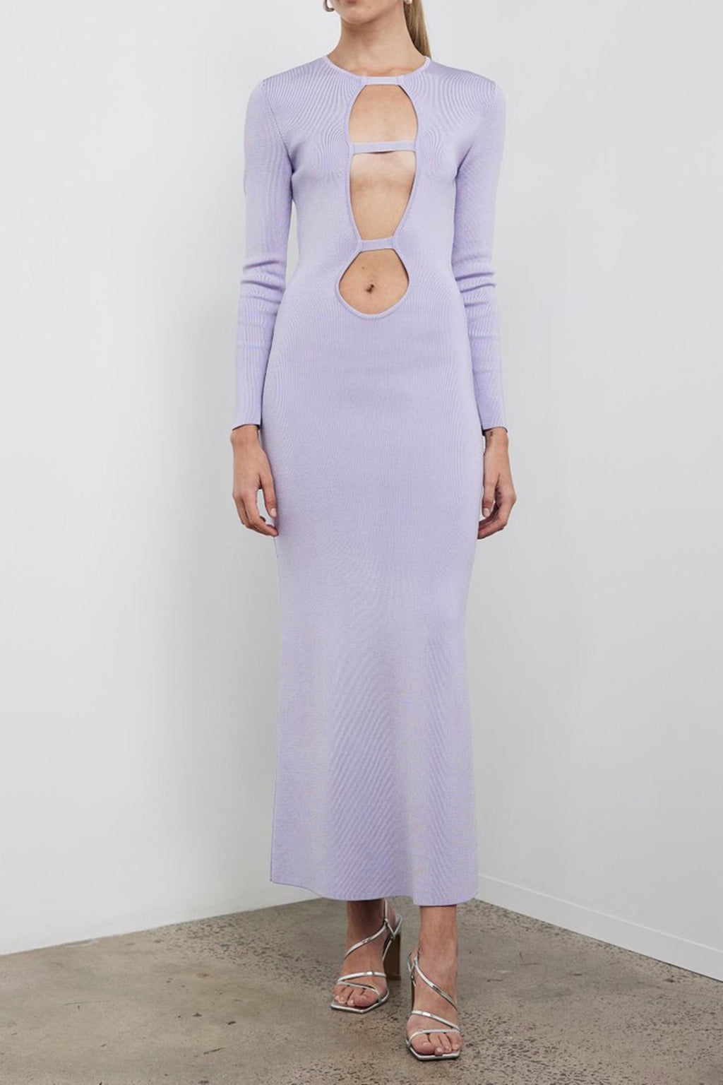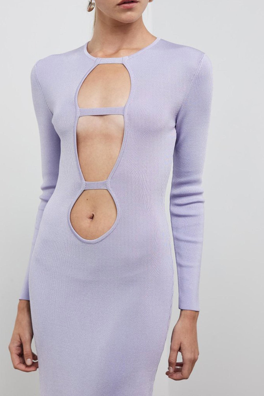 A incredible statement dress by Auteur. The Eva Double Bar Dress in soft lilac features a dramatic front cut-out detail to the navel in a thick stretch body con style.