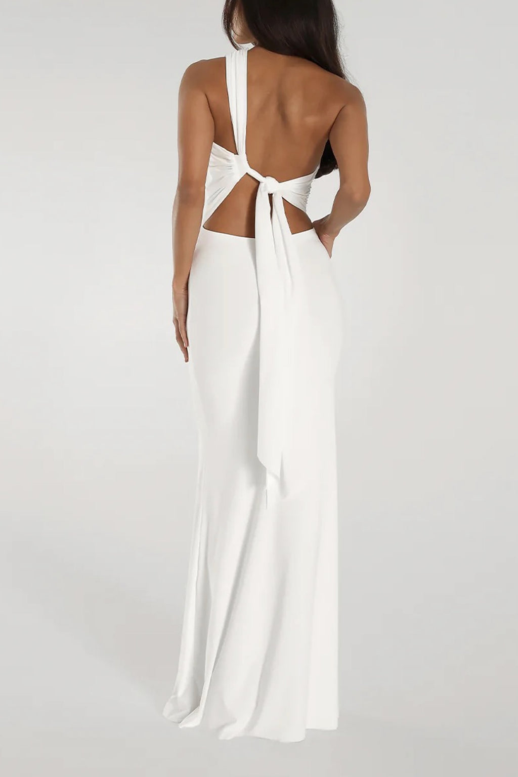 Use the neck and back ties to adjust fit and create your own look. Has stretch so could fit a smaller 8. Length has been shortened as very long originally. This suits an average or shorter height for floor length. Please ask for skirt length if needed. We also stock in black. Some light marks. Price has been reduced.