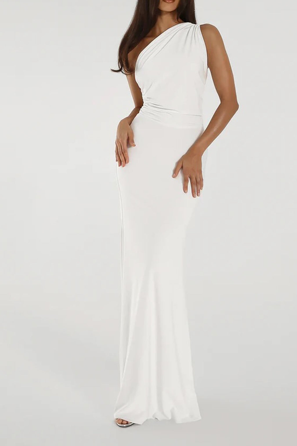 The Fabienne by Natalie Rolt is a stunning one-shoulder gown with versatile thread through strap details. Stretch Cavalli fabric ruches across the body and is complimented by a contoured, full-length skirt. Curved line details drops at the waistline, following and emphasising the feminine silhouette. The back of this gown is incredible.