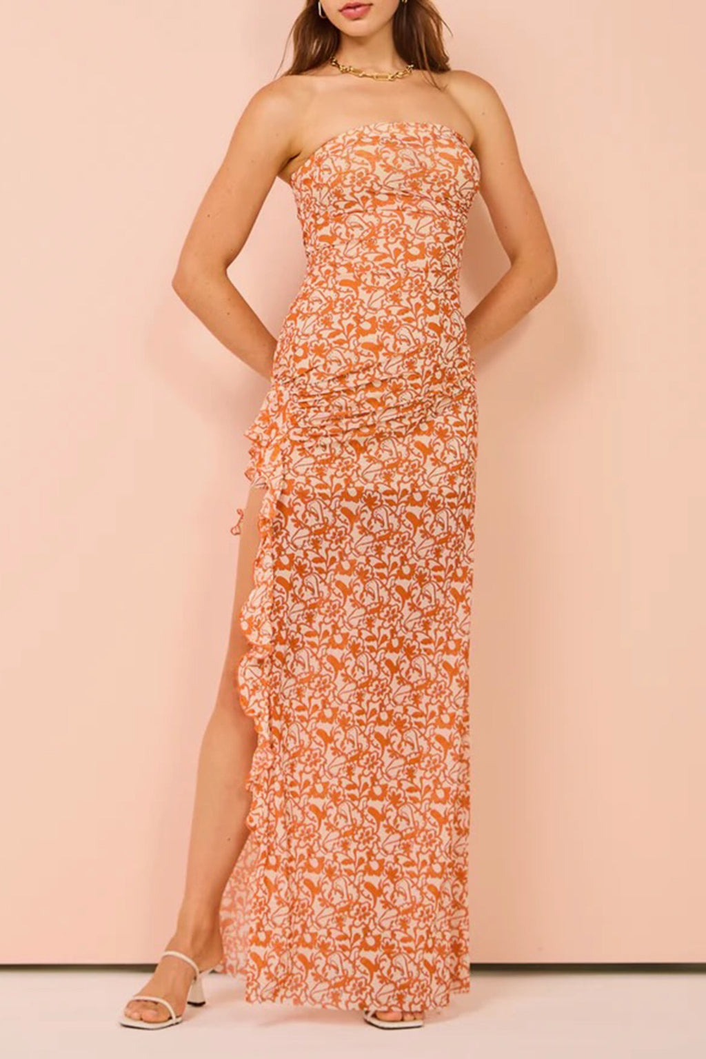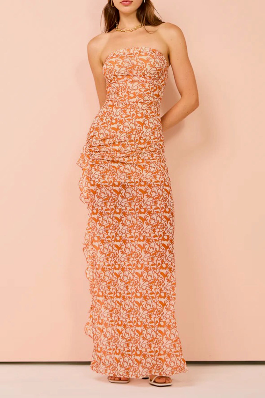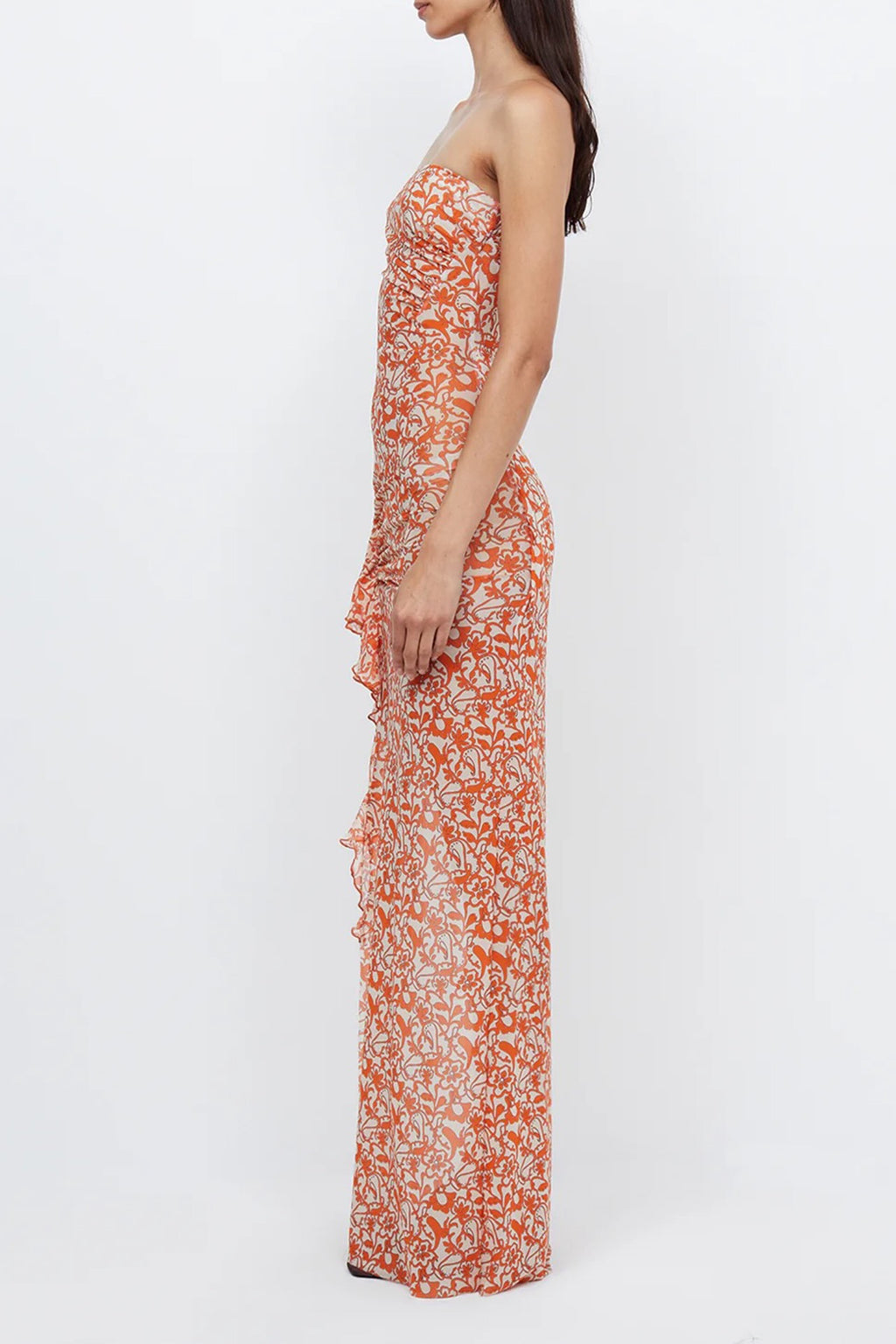 Introducing the Firefly Strapless Dress by Bec & Bridge. This beautiful strapless design features flattering tucks throughout the body of the dress, lining to the mini length, raw hemline, statement thigh high split & frill edge. Crafted from a soft mesh printed fabric.