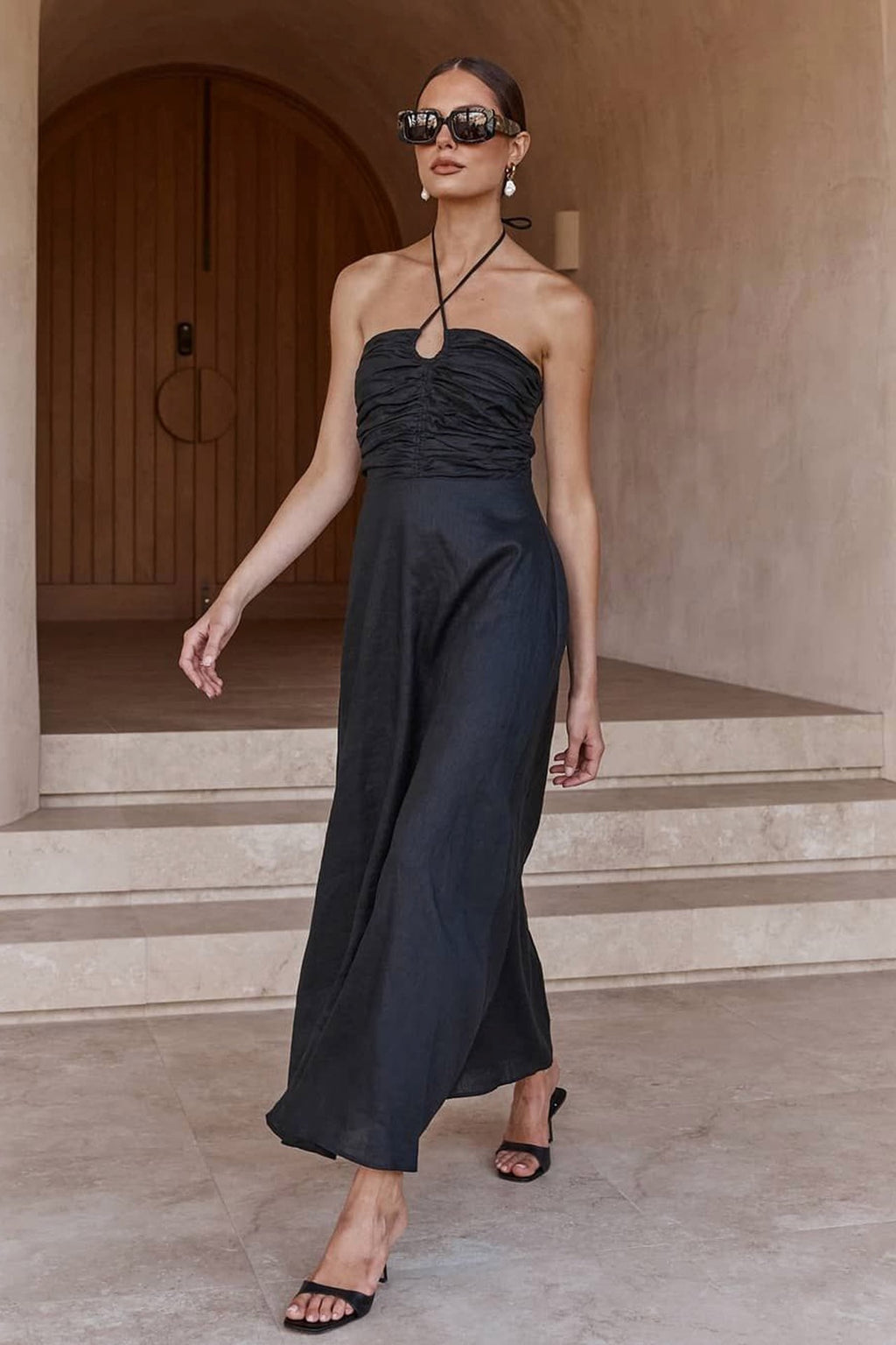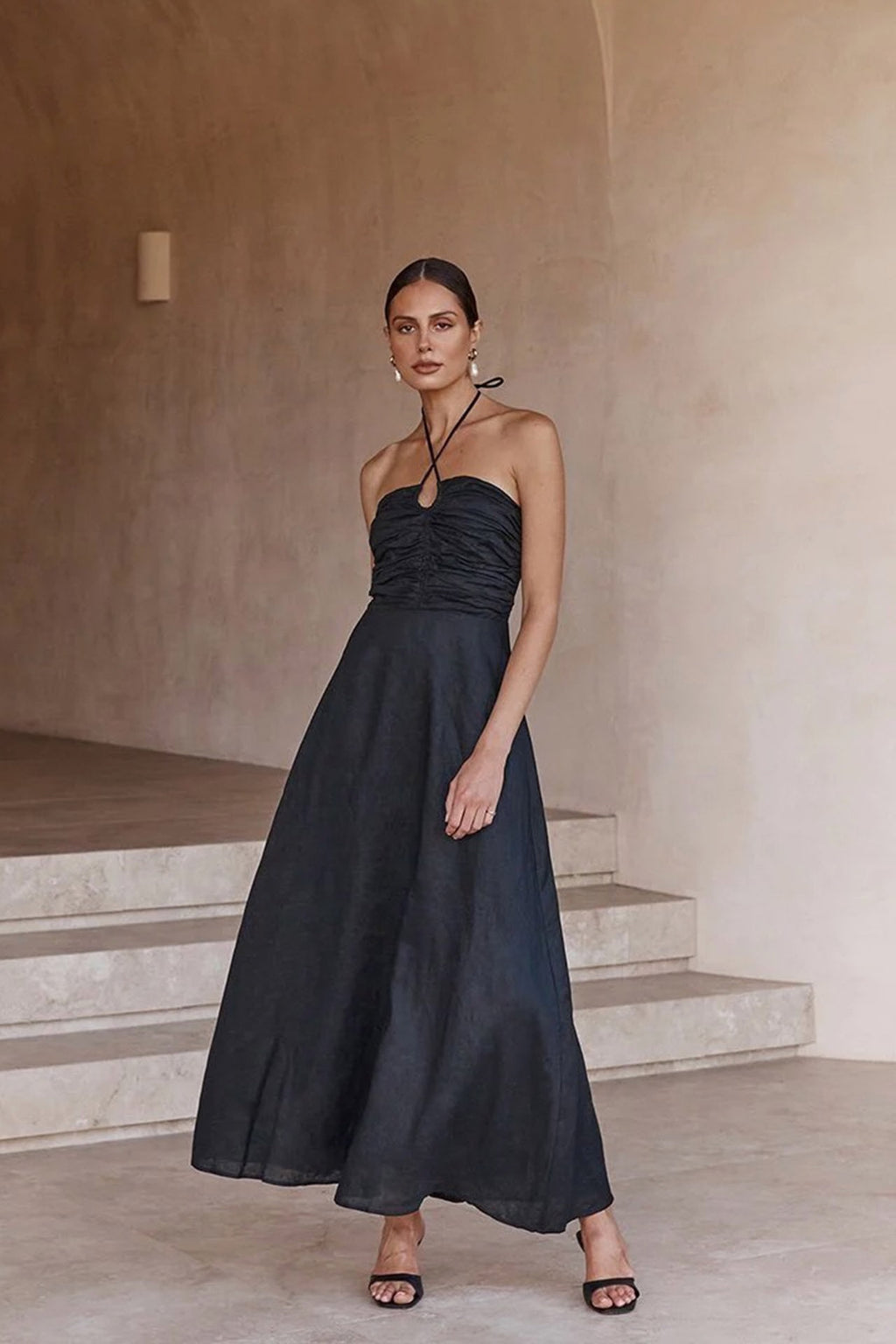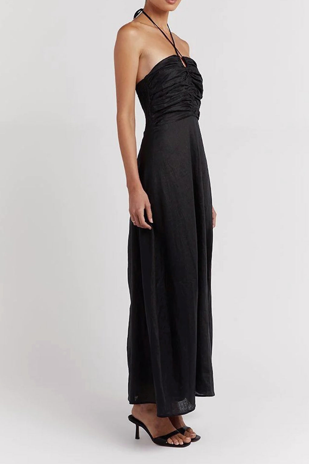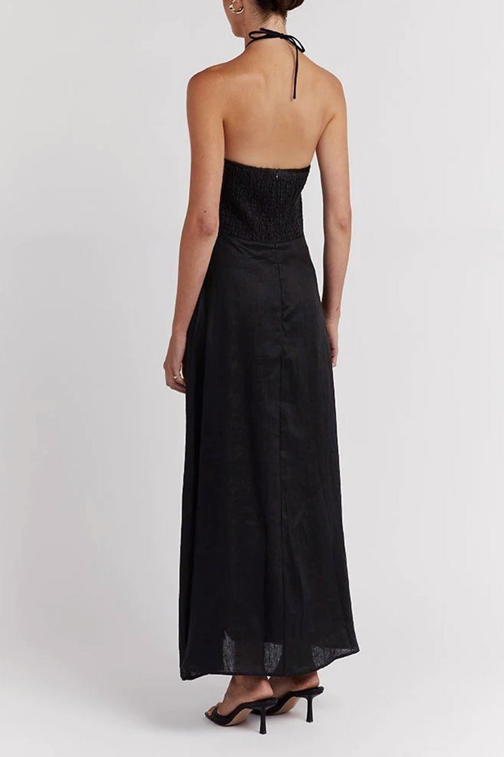A stunning black linen halter dress by Dissh with gathered bodice front and elastic back for the perfect fit.