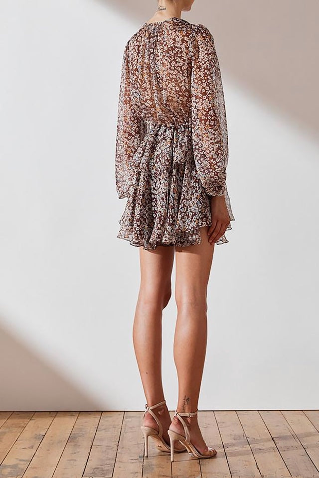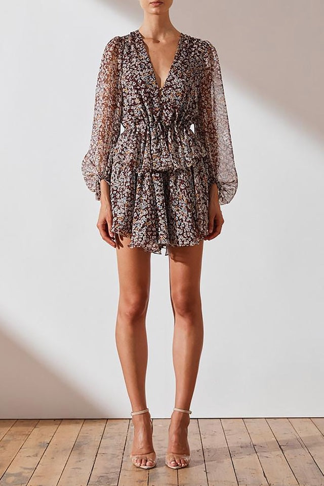 A gorgeous mini by Shona Joy. The Garner is made from a light weight crinkle chiffon. It has a semi-sheer appearance & features low v neckline with front button closure, midi length sleeves with elasticated cuff, drawstring waist and full mini skirt with asymmetrical hem and partial lining.