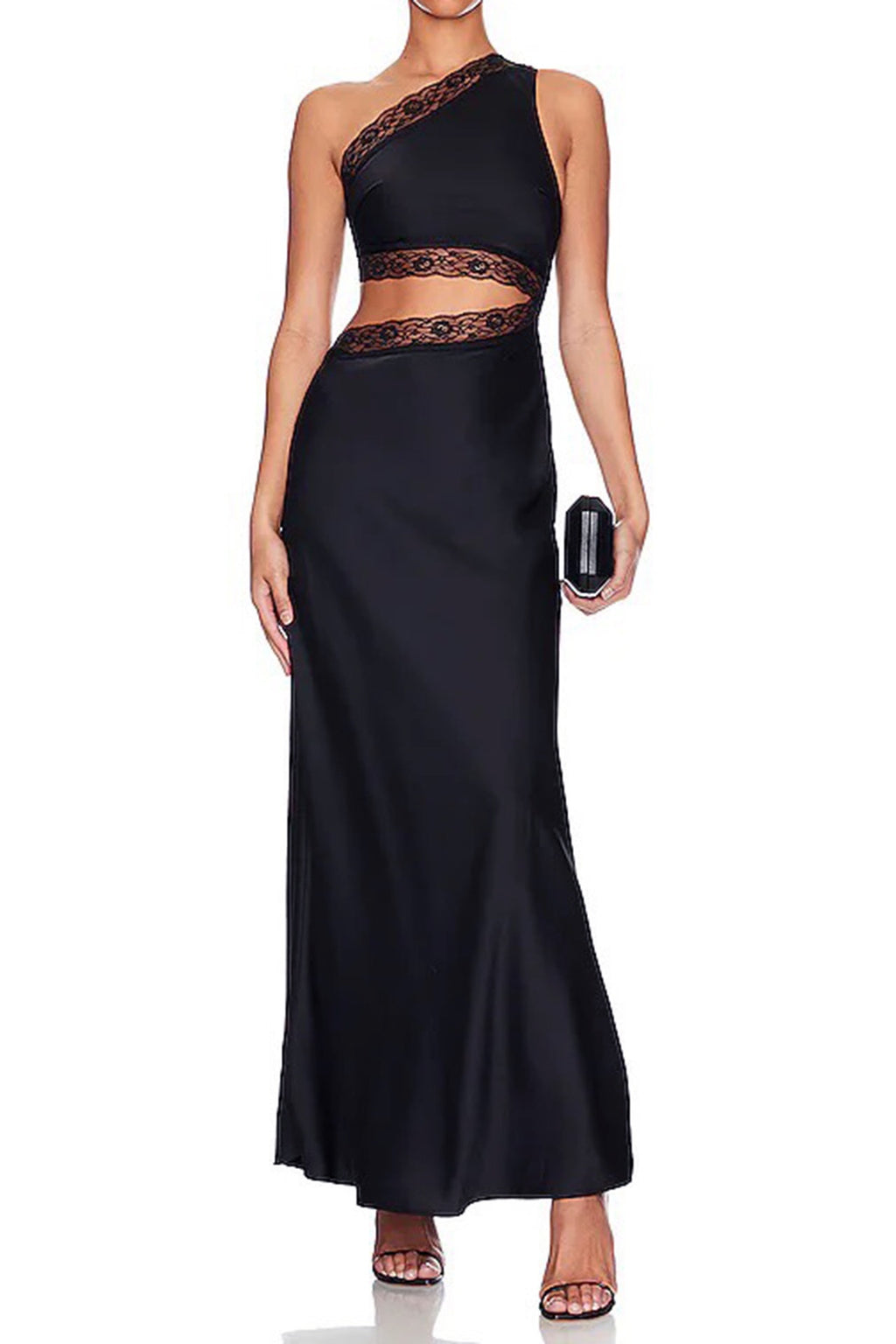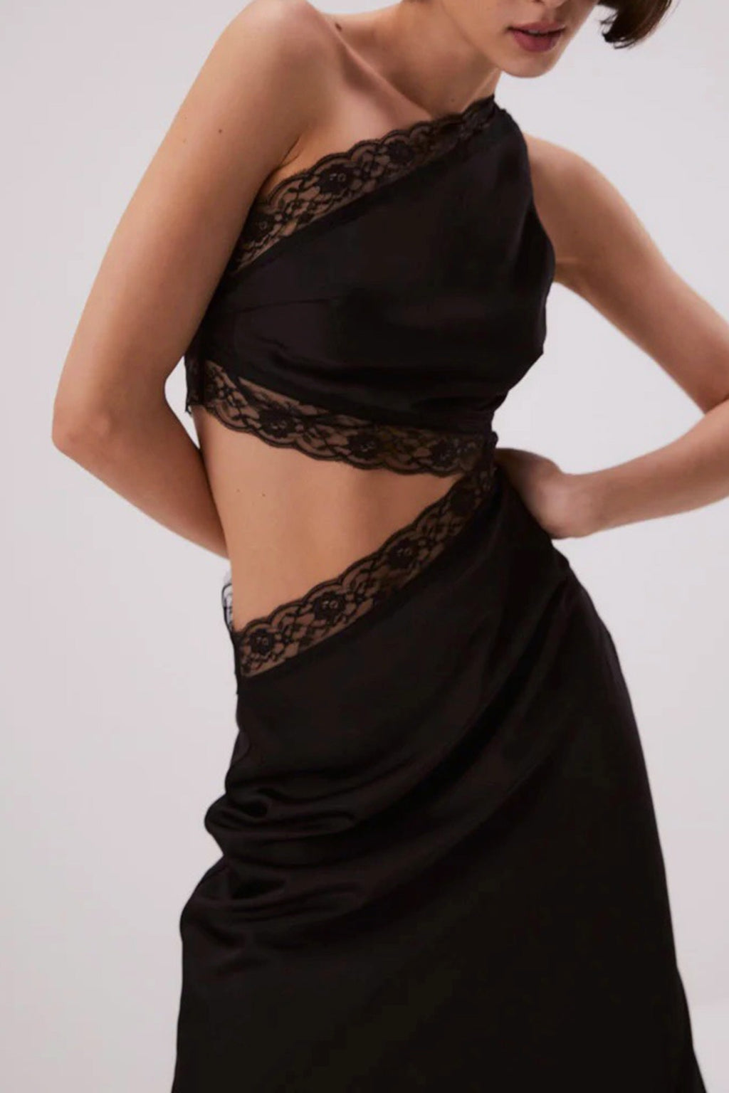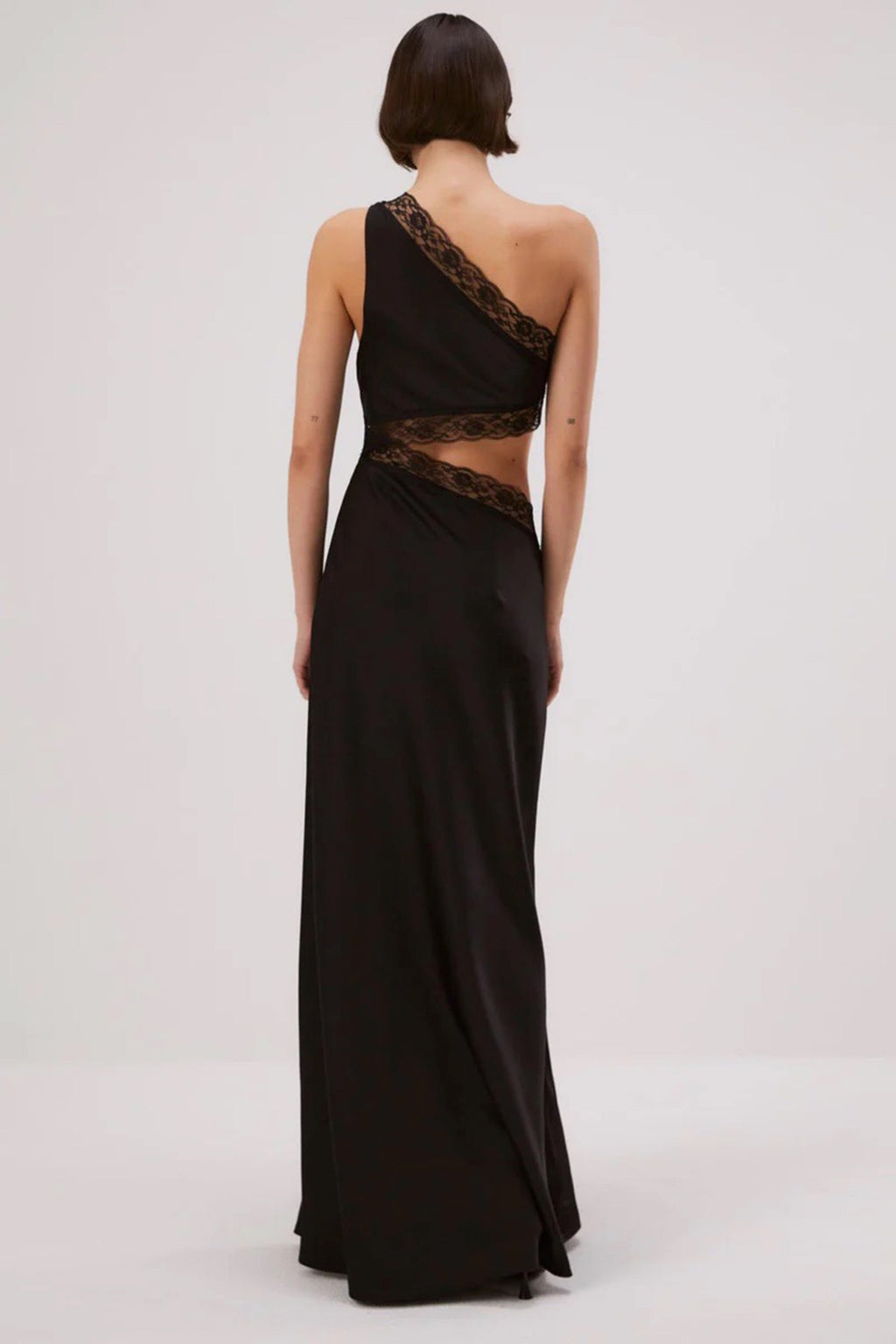 A beautiful design by Misha. The skirt has great movement & the lace trimming adds a delicate finish. The Jillian Features asymmetrical neckline, cutouts with lace trim & side split.