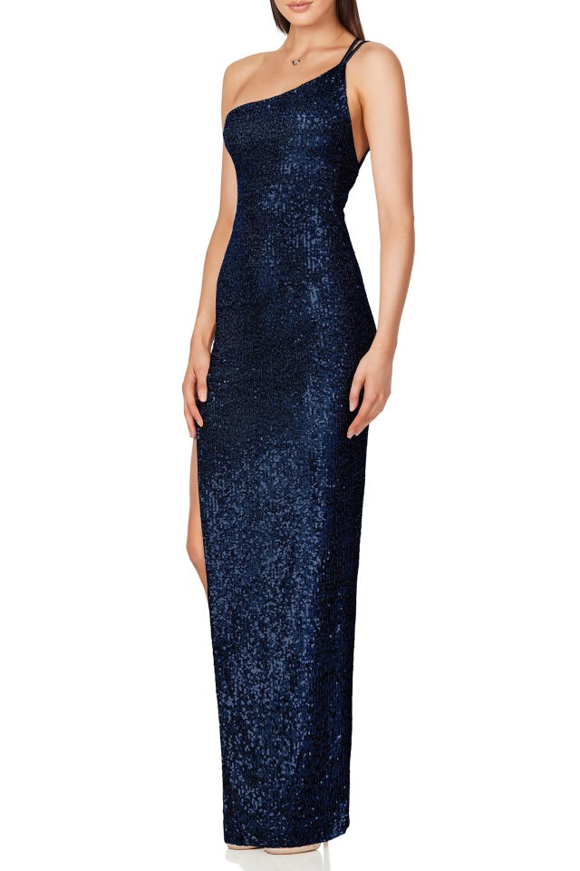 Stunning one shoulder sequin gown with incredible back detail and asymmetric fine satin straps. Invisible zip at back waist and thigh high side split. Crafted in stretch sequin and fully lined in super soft jersey.