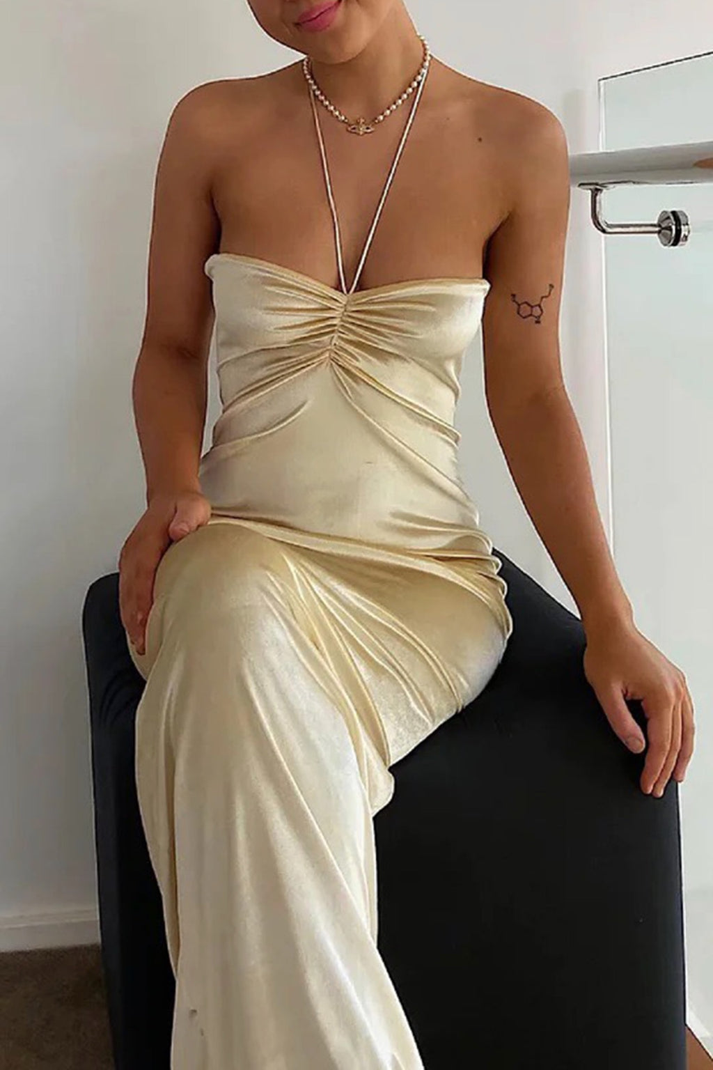A stunning little halter dress by HNTR the Label in champagne gold. Ruched feature at bust & gorgeous tie with gold hard wear to the ends that fall to your back.