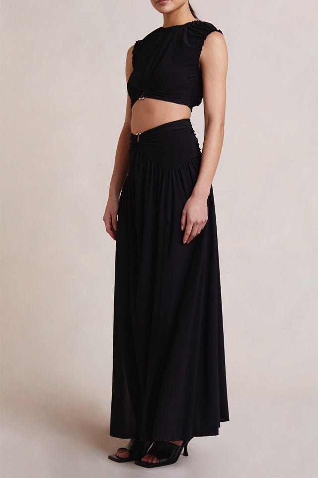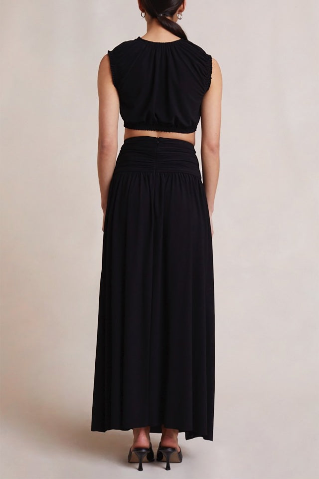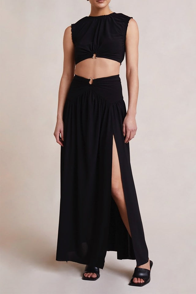 A gorgeous set by Bec & Bridge. The Minx maxi skirt features a gathered V waist panel and u-ring hardware detail on the centre waist. The skirt cinches in at the high waist and moves into a flowing gathered skirt with a 3/4 leg split. Styled with the Minx top this super cute crop features the same U ring hardware detail at the centre front, elasticated ruching around the neckline, sleeves & high waist.
