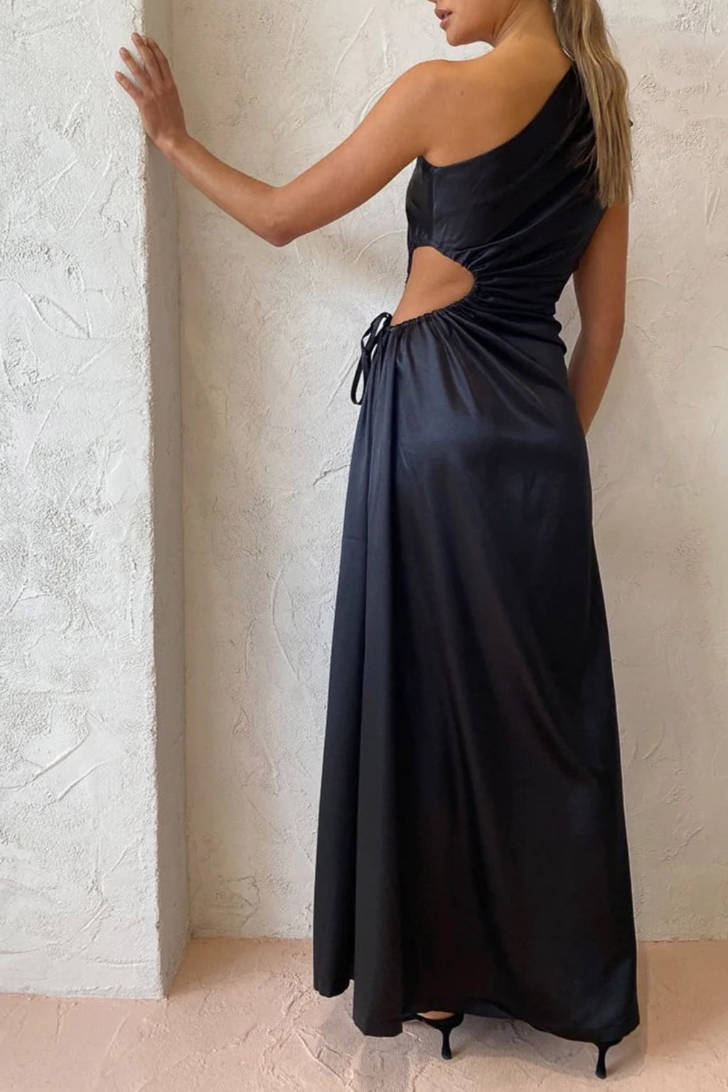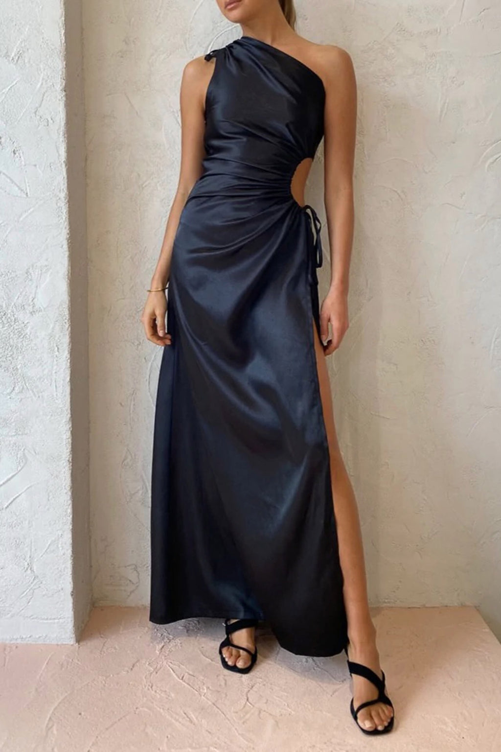 The Nour is a beautiful full length gown with in a stunning high sheen fabric. It features an elegant one-shoulder neckline, high split & cutout which tapers in at the waist. It has an adjustable tie at the hip/waist & sculptural ruching to showcase the feminine shape.