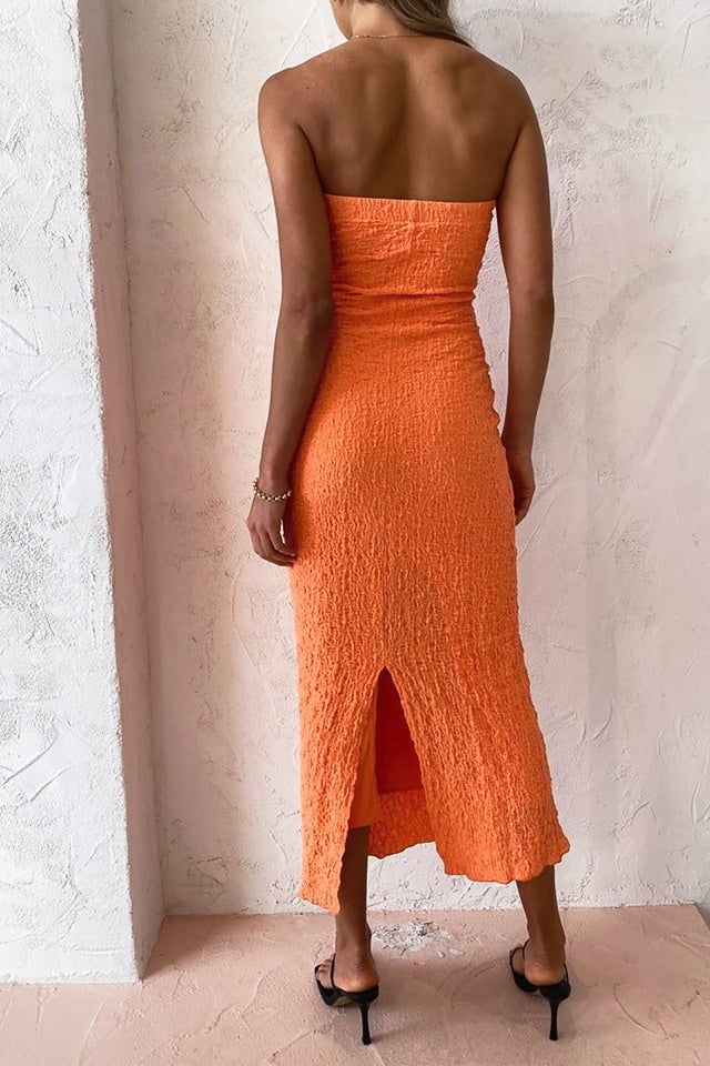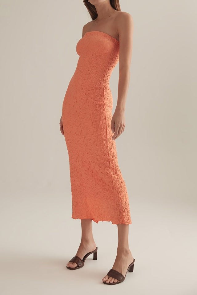 The Petra Dress from Ownley is a top rental for its figure hugging flattering fit. Cut in a stretch textured cotton fabrication this strapless midi has a back split for good movement.
