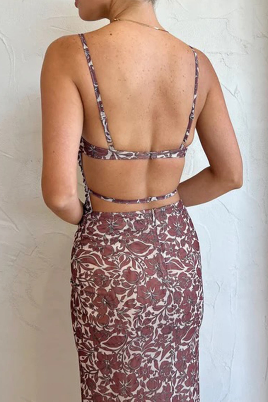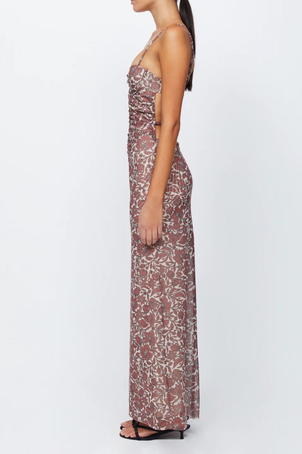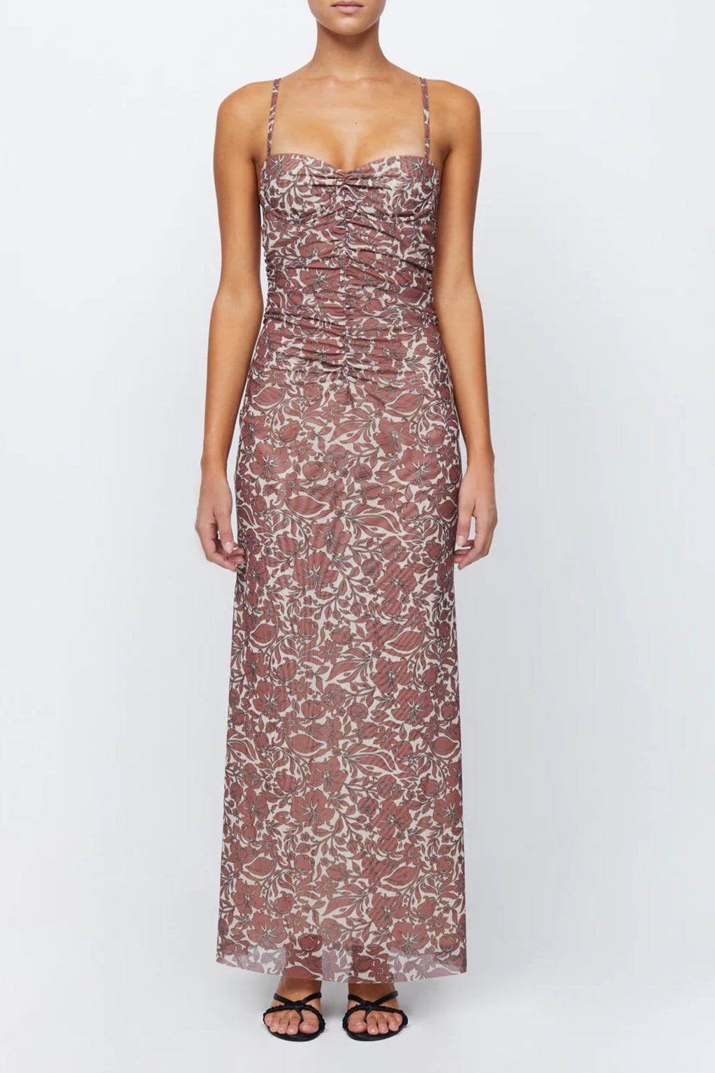 Crafted from a lustrous sheer, mesh print fabric, the Priya Midi Dress by Bec & Bridge features a gathered bodice, sweetheart neckline & dramatic straps that wrap around to an open back. The dress has boning to bust area & is detailed with e-hook closures + raw hem.