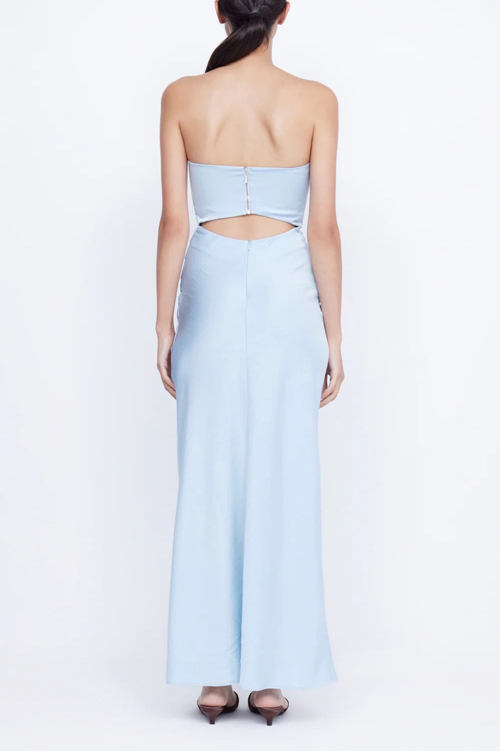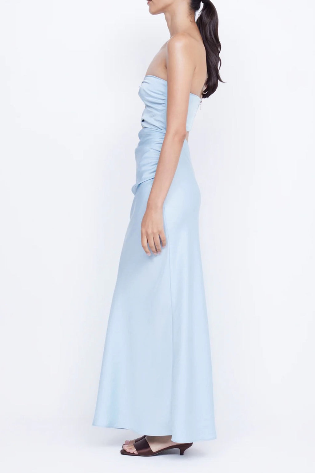 The Rochelle Twist Strapless Dress is a statement maxi dress which features a detachable halter strap, gathered detailing at the bust, centre front & back cut outs + tucks at side seams to flatter the silhouette before flowing into a relaxed fit skirt.