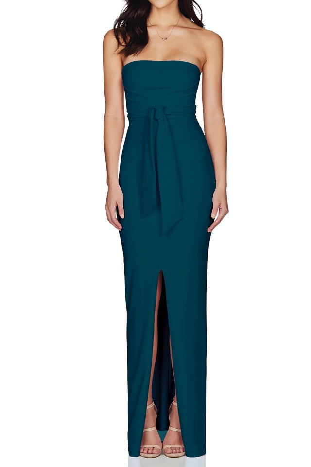 The Royal is a stunning strapless gown by Nookie with cross over panels at the front, a waist tie to cinch in your waist and is finished with a high centre front split. This floor skimming gown is crafted in Nookie’s signature scuba crepe fabric ensuring a firm fit. It is fully lined and fastens with invisible zip at back.