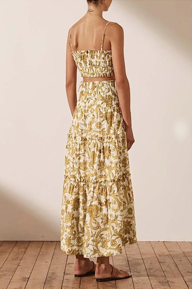 Stunning top & matching skirt by Shona Joy in a beautiful regal gold print. The crop style top features shirred details & adjustable straps. Skirt features shirred details, drawstring at sides and beautiful tiered frill details.