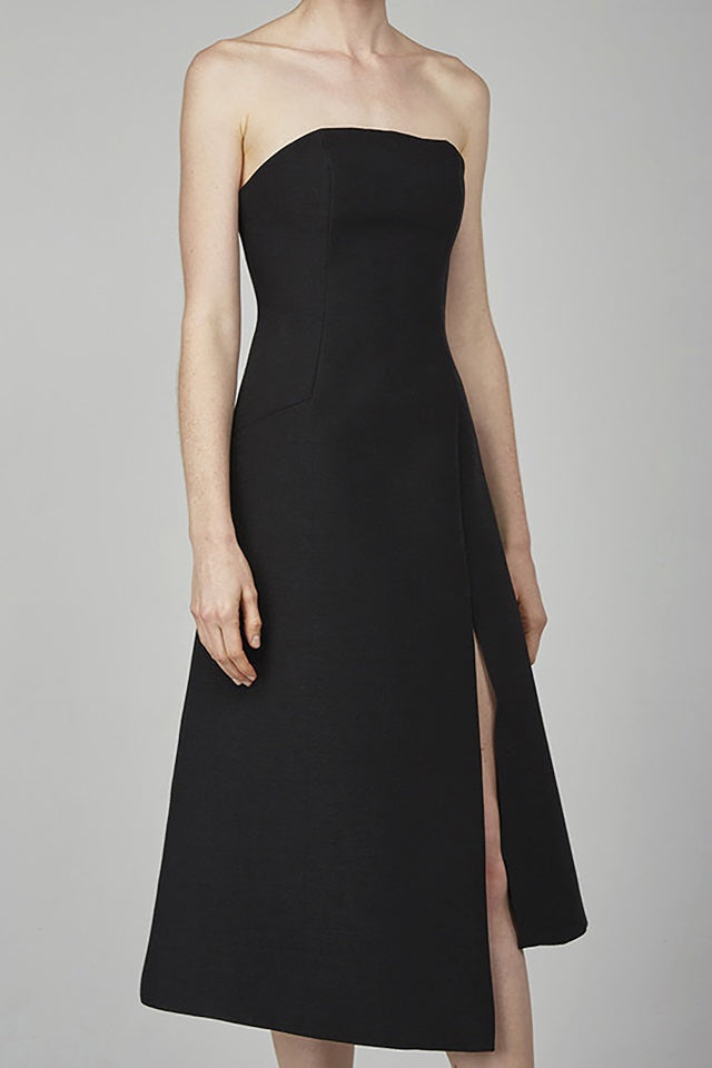 The Seasons Change is a fitted strapless dress with A-line shaped skirt, front split, shaped hemline in a mid-weight textured fabric with lining. Such a lovely dress.
