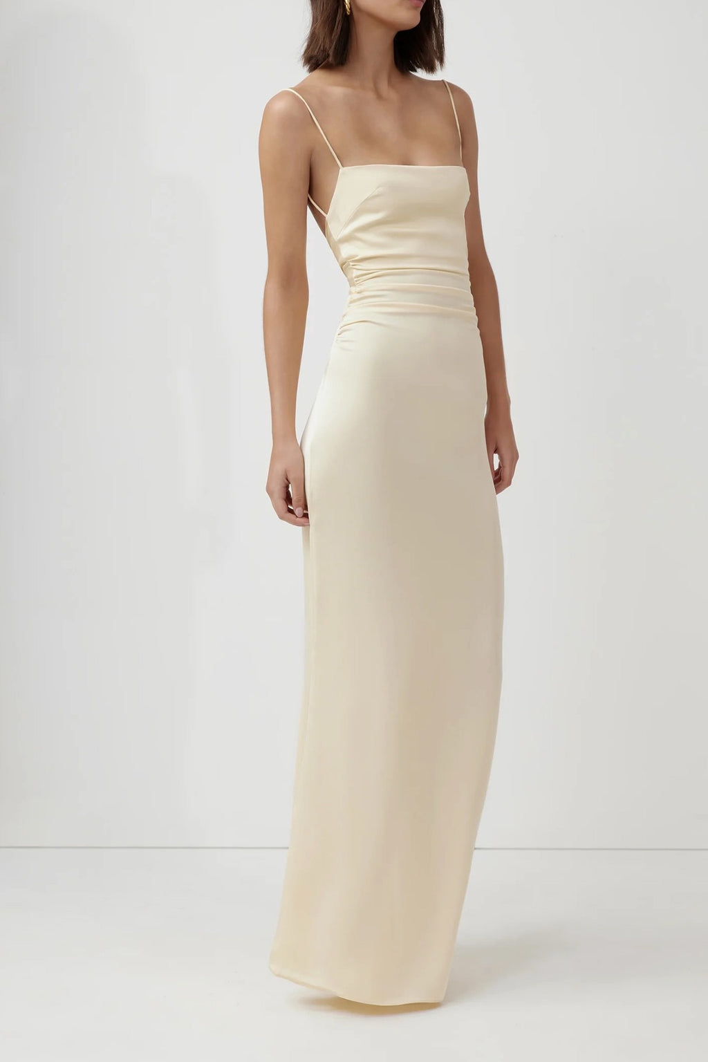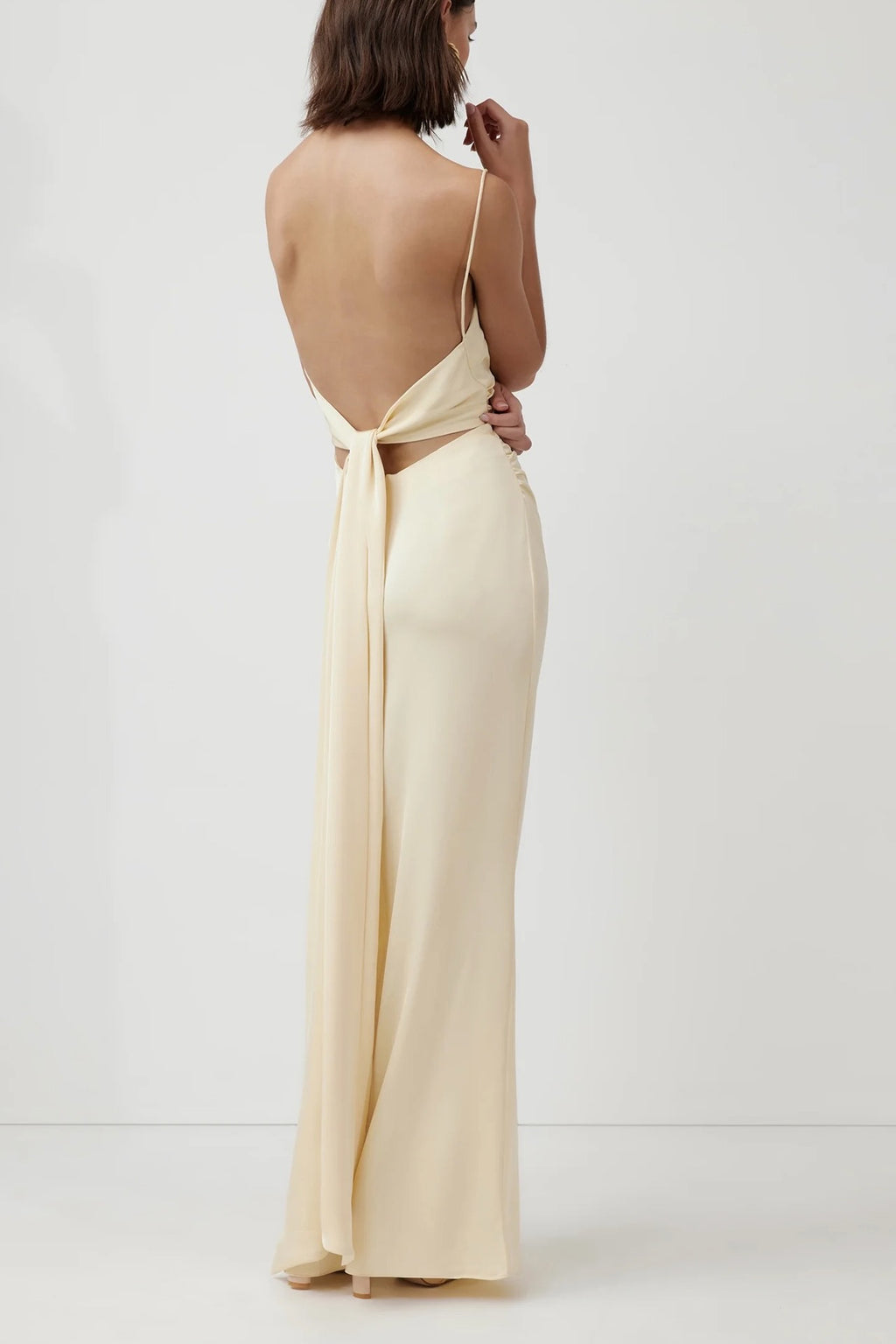 Sold out colour. The Venus dress is cut from a luxe, heavyweight recycled satin. It features delicate gathers at the waist and and a slight mermaid skirt. The straight neckline with simple spaghetti straps eventuate into a scooped back design with a free flowing sash that can be tied into a knot or bow at the waist. It features flattering ruching across waist, back tie up sash and a lined bodice.