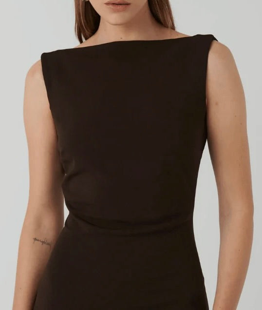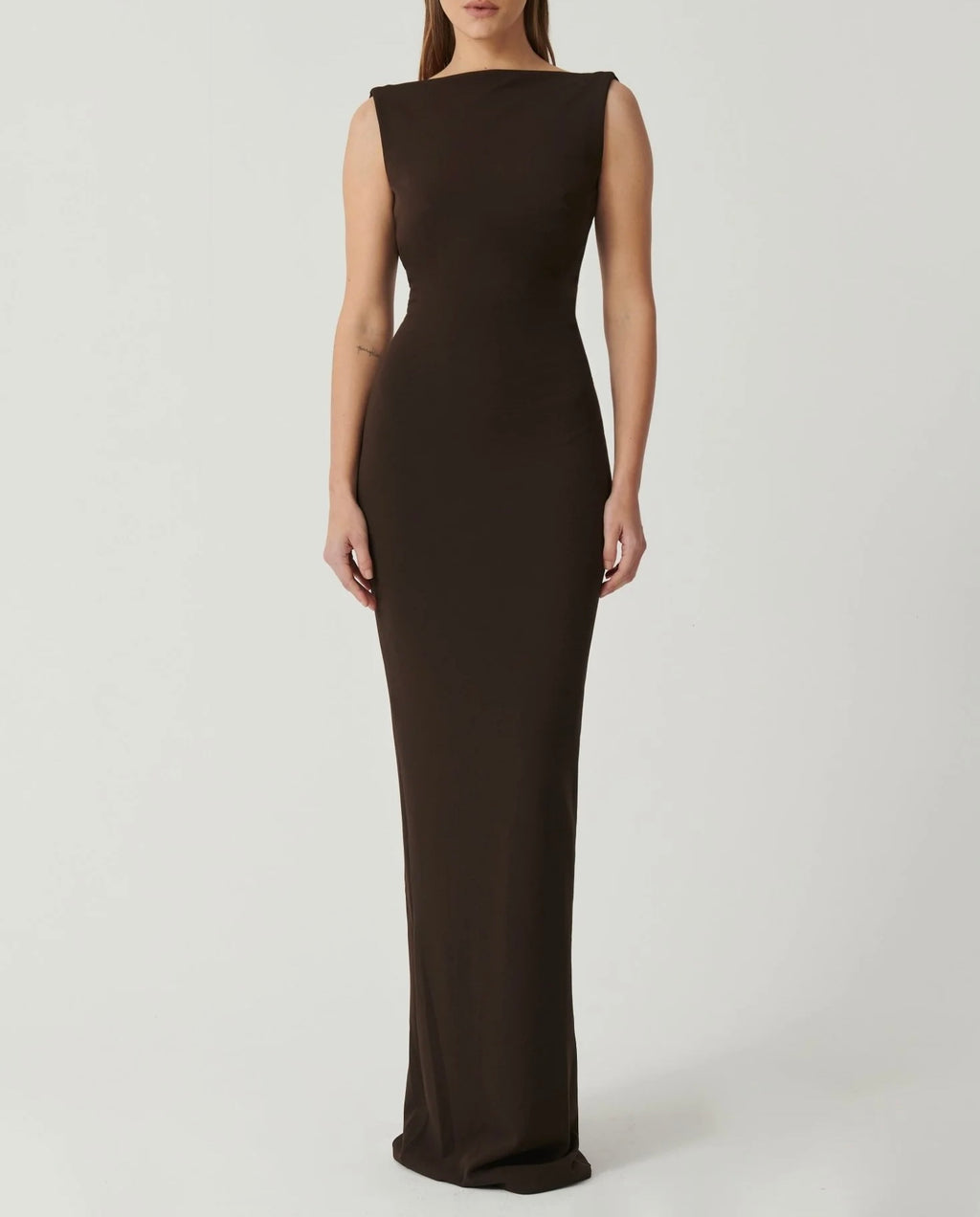 The colour is incredible - nicer than studio pics (a very dark chocolate). Long maxi length - best on a taller height. Couple of minor pulls - price reflects. Gown is a generous 12 fit. eg can fit a 12/14. We also stock in other colours.