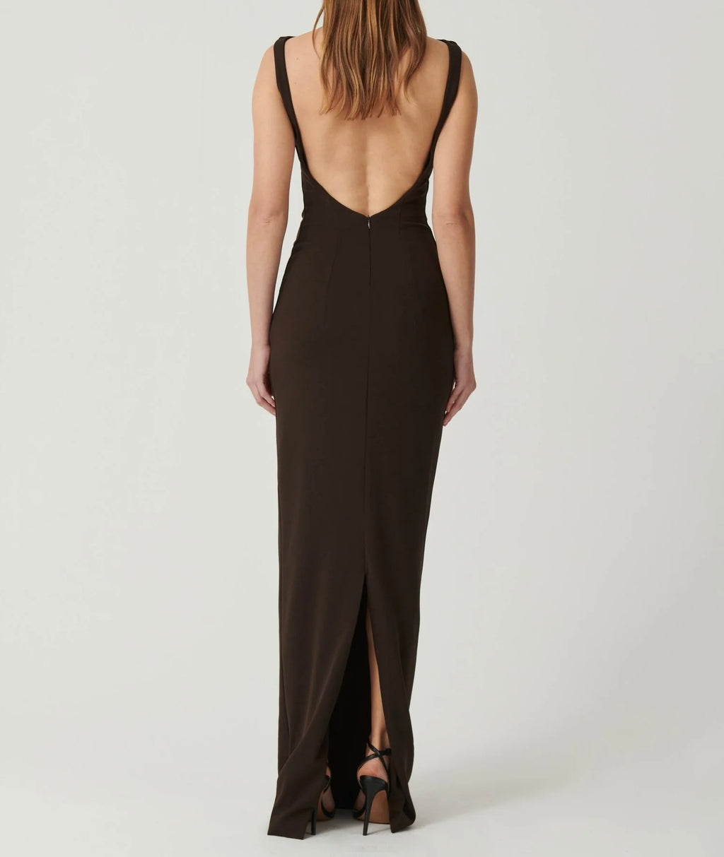The Verona gown by Effie Kats is a stunning gown. Made from luxurious stretch-crepe. It features a high neckline, low back, a simplistic silhouette & back split for ease of movement.